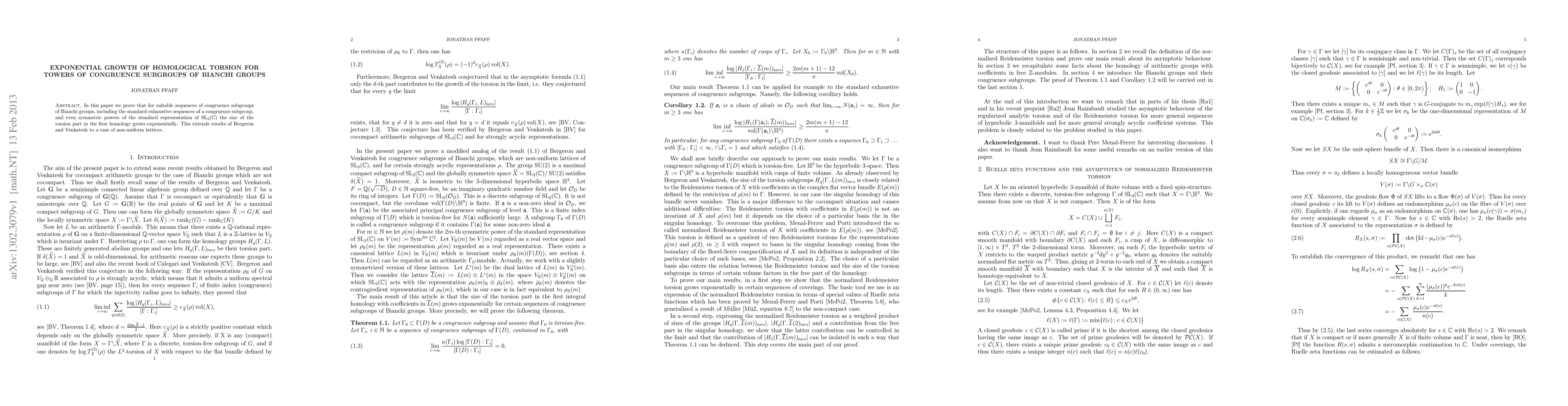 In this paper we prove that for suitable sequences of congruence subgroups of Bianchi groups, including the standard exhaustive sequences of a congruence subgroup, and even symmetric powers of the standard representation of Sl_2(C) the size of the torsion part in the first homology grows exponentially. This extends results of Bergeron and Venkatesh to a case of non-uniform lattices.