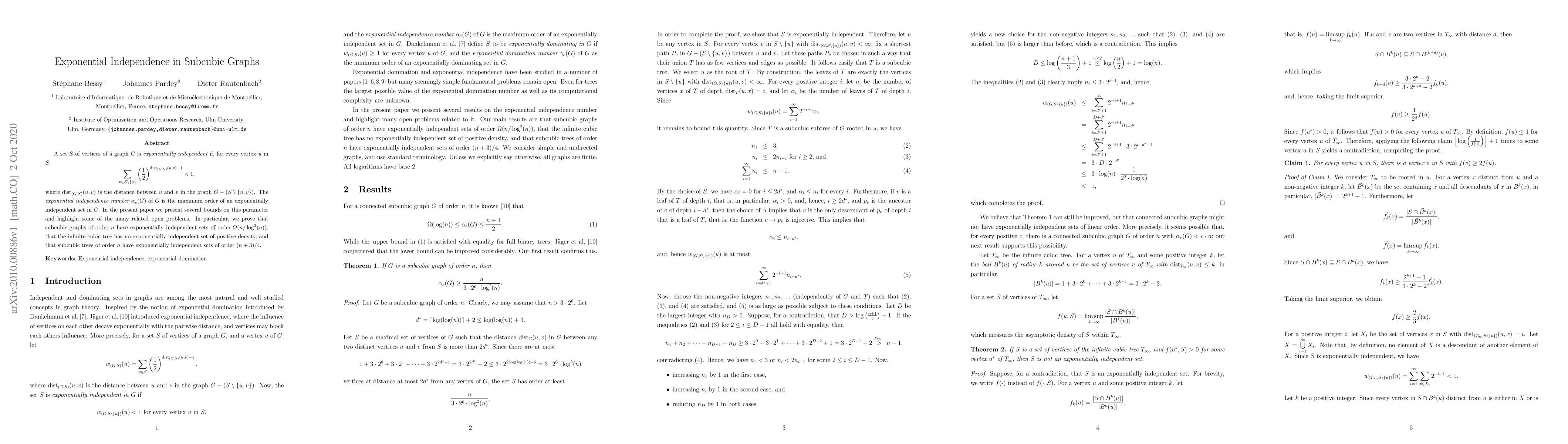 A set $S$ of vertices of a graph $G$ is exponentially independent if, for every vertex $u$ in $S$, $$\sum\limits_{v\in S\setminus \{ u\}}\left(\frac{1}{2}\right)^{{\rm dist}_{(G,S)}(u,v)-1}<1,$$ where ${\rm dist}_{(G,S)}(u,v)$ is the distance between $u$ and $v$ in the graph $G-(S\setminus \{ u,v\})$. The exponential independence number $\alpha_e(G)$ of $G$ is the maximum order of an exponentially independent set in $G$. In the present paper we present several bounds on this parameter and highlight some of the many related open problems. In particular, we prove that subcubic graphs of order $n$ have exponentially independent sets of order $\Omega(n/\log^2(n))$, that the infinite cubic tree has no exponentially independent set of positive density, and that subcubic trees of order $n$ have exponentially independent sets of order $(n+3)/4$.