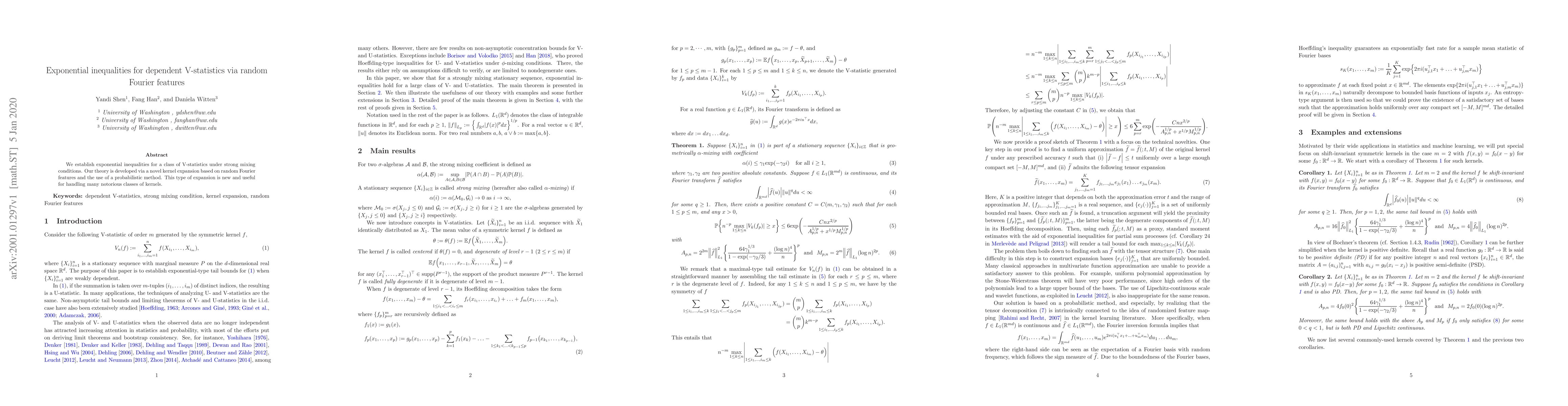 Summary: This paper establishes exponential inequalities for V-statistics under strong mixing conditions using a novel kernel expansion based on random Fourier features. The probabilistic method and new expansion technique are effective for managing various complex kernels.
