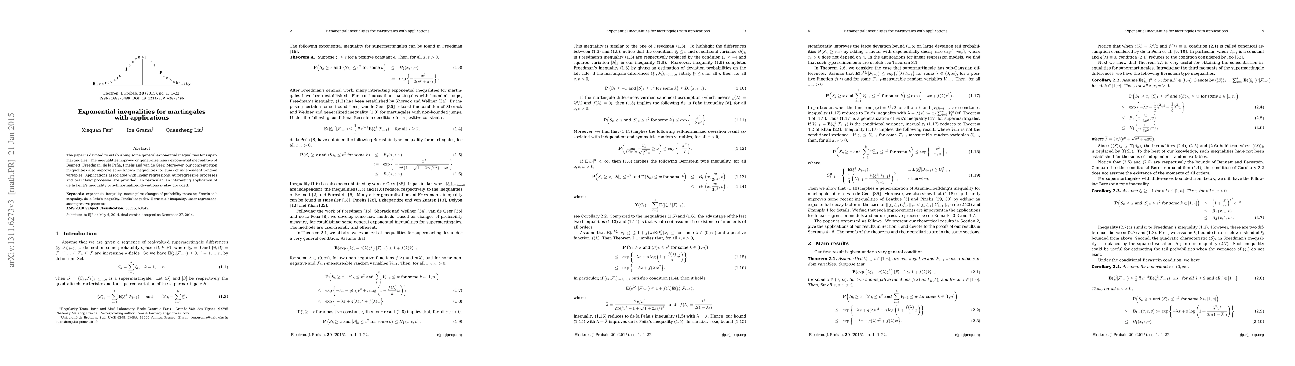 This paper establishes improved exponential inequalities for supermartingales, generalizing existing results by Bennett, Freedman, de la Peña, Pinelis, and van de Geer. It also extends these inequalities to sums of independent random variables, with applications in linear regressions, autoregressive processes, and branching processes, including a notable application of de la Peña's inequality to self-normalized deviations.
