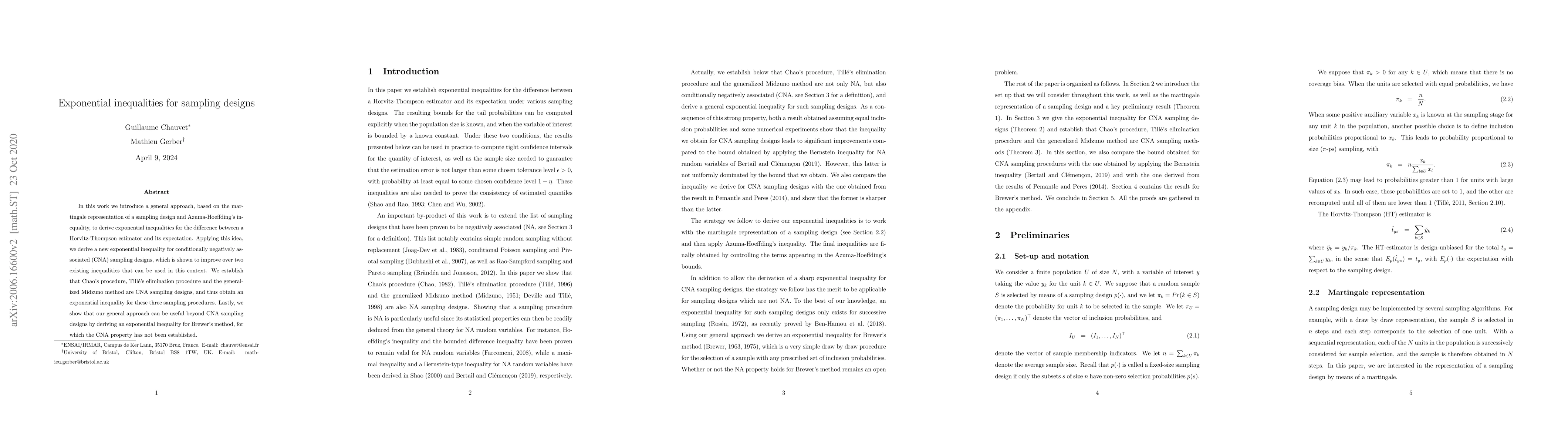 In this work we introduce a general approach, based on the mar-tingale representation of a sampling design and Azuma-Hoeffding's inequality , to derive exponential inequalities for the difference between a Horvitz-Thompson estimator and its expectation. Applying this idea, we establish such inequalities for Chao's procedure, Till{\'e}'s elimination procedure, the generalized Midzuno method as well as for Brewer's method. As a by-product, we prove that the first three sampling designs are (conditionally) negatively associated. For such sampling designs, we show that that the inequality we obtain is usually sharper than the one obtained by applying known results for negatively associated random variables.