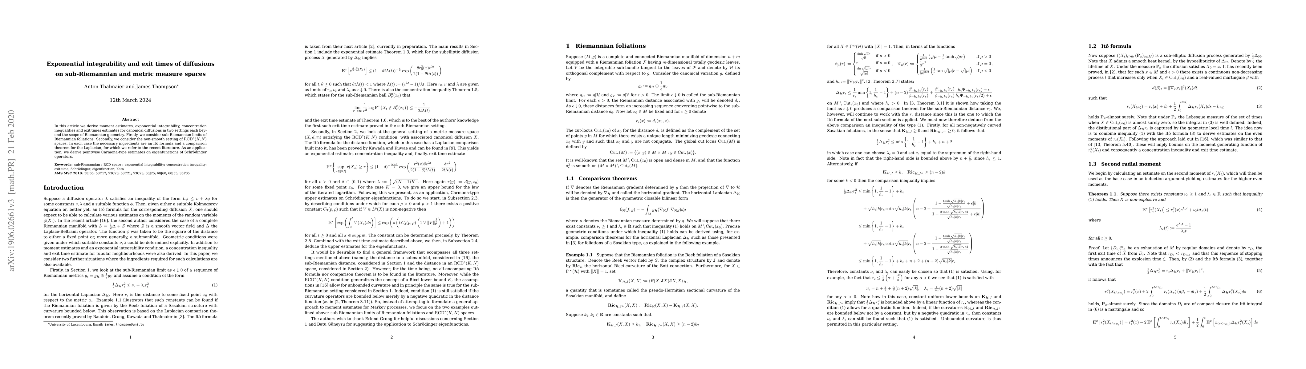 In this article we derive moment estimates, exponential integrability, concentration inequalities and exit times estimates for canonical diffusions in two settings each beyond the scope of Riemannian geometry. Firstly, we consider sub-Riemannian limits of Riemannian foliations. Secondly, we consider the non-smooth setting of $\mathrm{RCD}^*(K,N)$ spaces. In each case the necessary ingredients are an It\^{o} formula and a comparison theorem for the Laplacian, for which we refer to the recent literature. As an application, we derive pointwise Carmona-type estimates on eigenfunctions of Schr\"{o}dinger operators.