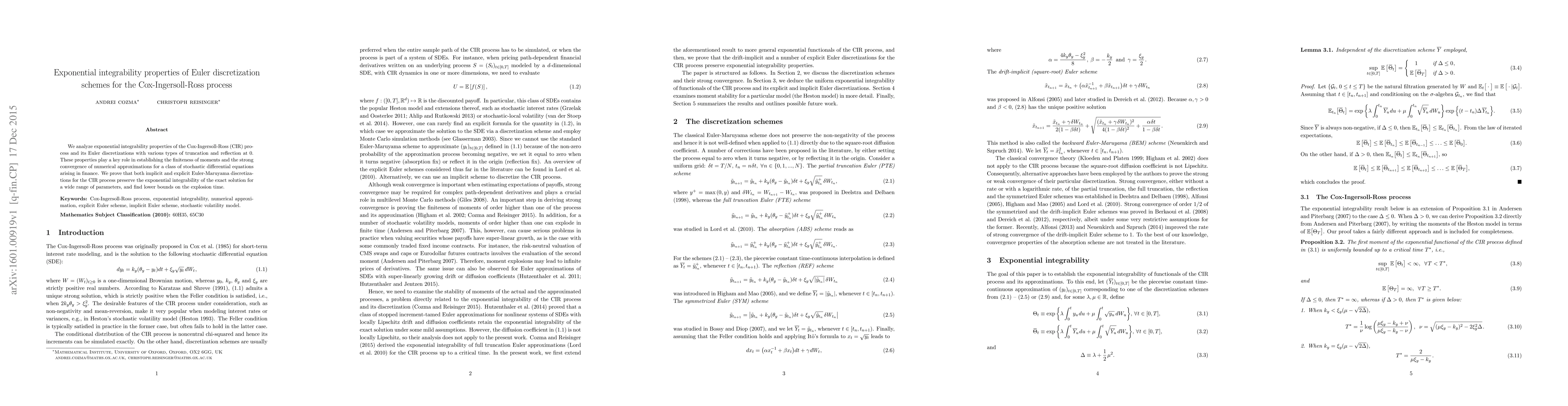 This paper investigates the exponential integrability properties of Euler discretizations for the Cox-Ingersoll-Ross (CIR) process, showing that the discretizations preserve these properties and establish finiteness of moments and strong convergence for the numerical approximations used in financial modeling. Lower bounds on the explosion time are also derived.