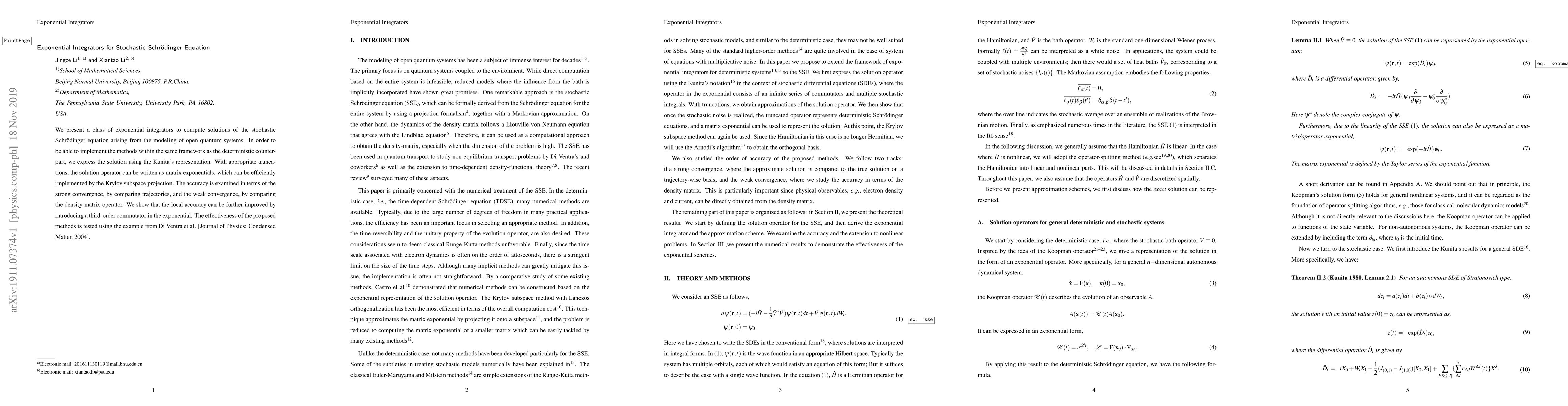 This paper introduces exponential integrators for solving the stochastic Schrödinger equation in open quantum systems, employing Kunita's representation and Krylov subspace methods for efficient computation. The methods' accuracy is assessed through strong and weak convergence, with enhancements achieved via a third-order commutator.
