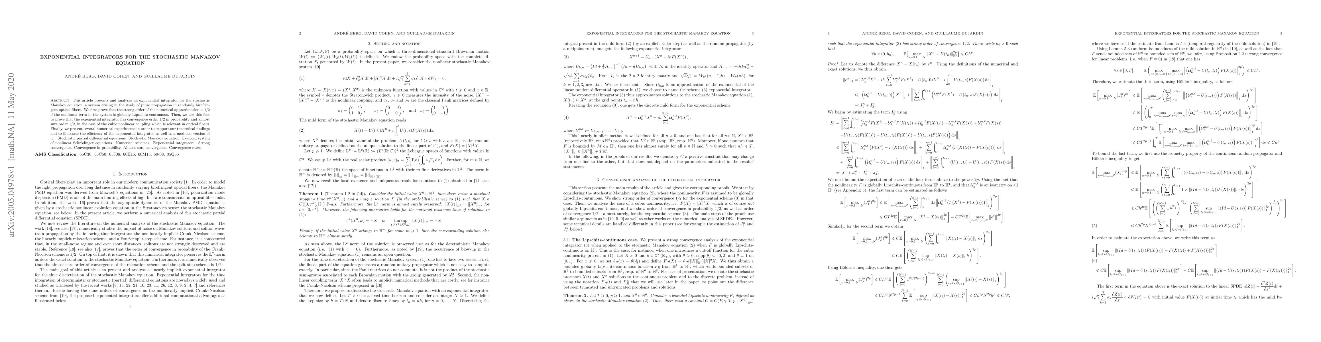 This article presents and analyses an exponential integrator for the stochastic Manakov equation, a system arising in the study of pulse propagation in randomly birefringent optical fibers. We first prove that the strong order of the numerical approximation is $1/2$ if the nonlinear term in the system is globally Lipschitz-continuous. Then, we use this fact to prove that the exponential integrator has convergence order $1/2$ in probability and almost sure order $1/2$, in the case of the cubic nonlinear coupling which is relevant in optical fibers. Finally, we present several numerical experiments in order to support our theoretical findings and to illustrate the efficiency of the exponential integrator as well as a modified version of it.