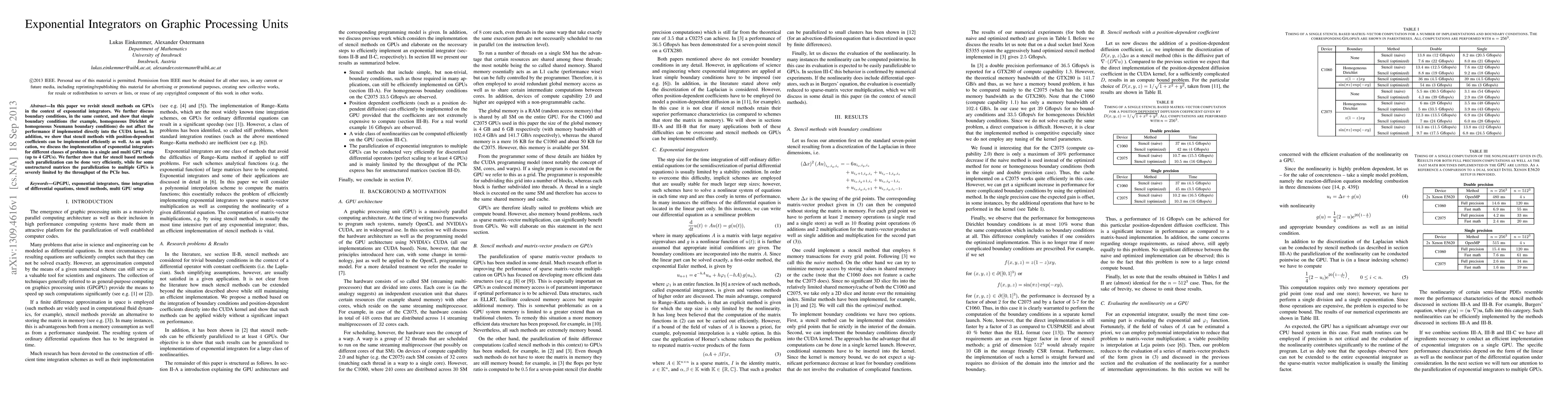 This paper explores the implementation of exponential integrators using stencil methods on GPUs, demonstrating efficient handling of simple boundary conditions directly in CUDA kernels. It also discusses the parallelization of these methods across multiple GPUs, highlighting the efficiency of stencil-based methods but noting limitations due to PCIe bus throughput for unstructured matrices.