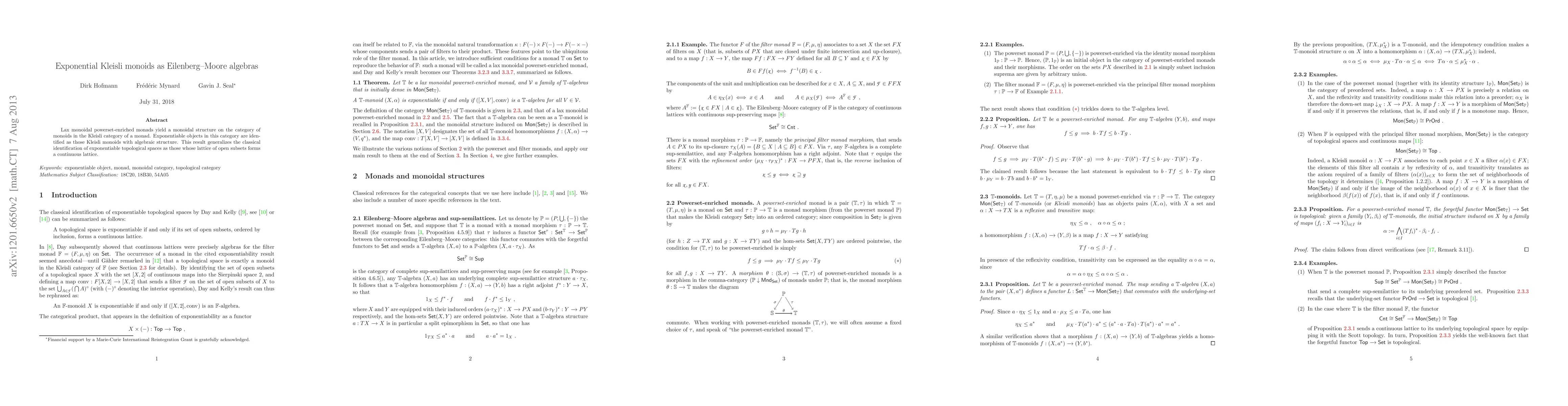 Lax monoidal powerset-enriched monads yield a monoidal structure on the category of monoids in the Kleisli category of a monad. Exponentiable objects in this category are identified as those Kleisli monoids with algebraic structure. This result generalizes the classical identification of exponentiable topological spaces as those whose lattice of open subsets forms a continuous lattice.