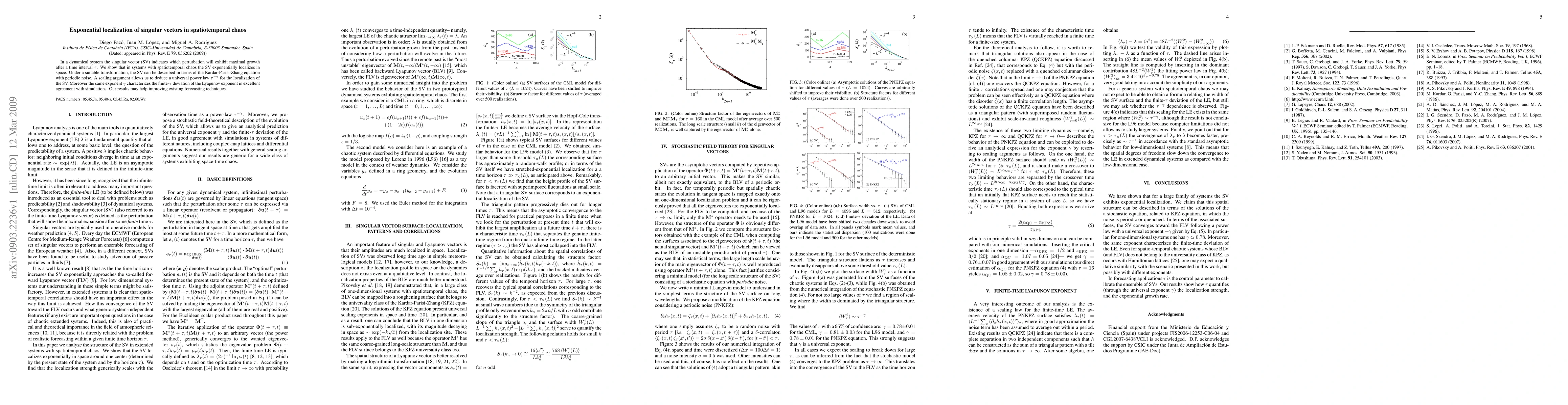 In a dynamical system the singular vector (SV) indicates which perturbation will exhibit maximal growth after a time interval $\tau$. We show that in systems with spatiotemporal chaos the SV exponentially localizes in space. Under a suitable transformation, the SV can be described in terms of the Kardar-Parisi-Zhang equation with periodic noise. A scaling argument allows us to deduce a universal power law $\tau^{-\gamma}$ for the localization of the SV. Moreover the same exponent $\gamma$ characterizes the finite-$\tau$ deviation of the Lyapunov exponent in excellent agreement with simulations. Our results may help improving existing forecasting techniques.