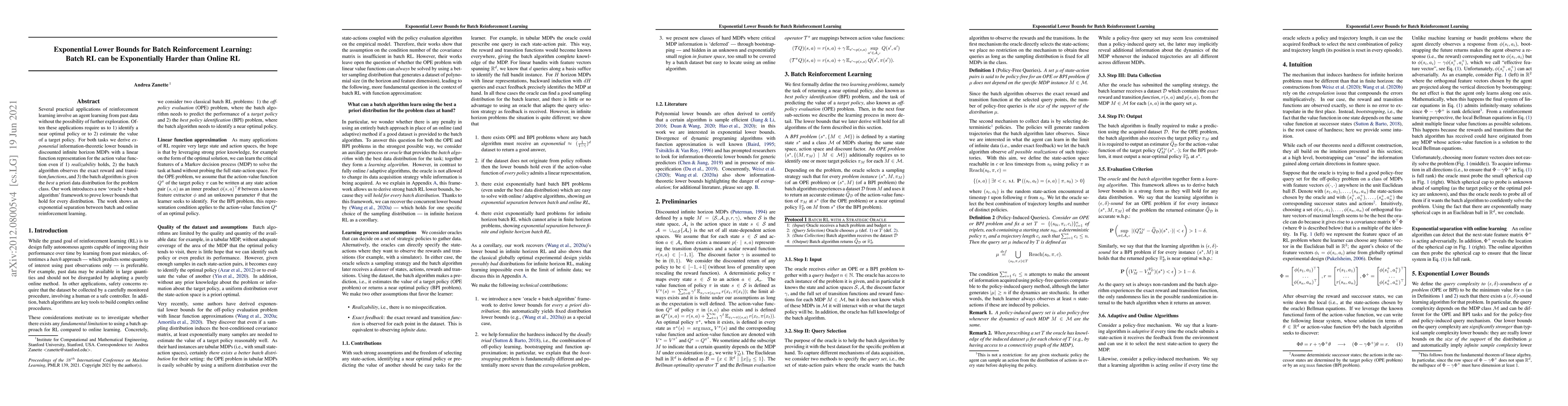 The paper establishes exponential information-theoretic lower bounds for batch reinforcement learning tasks, demonstrating that batch RL can be exponentially harder than online RL, even under optimal conditions, using a new `oracle + batch algorithm' framework. The findings reveal a significant gap between the efficiency of batch and online reinforcement learning methods.