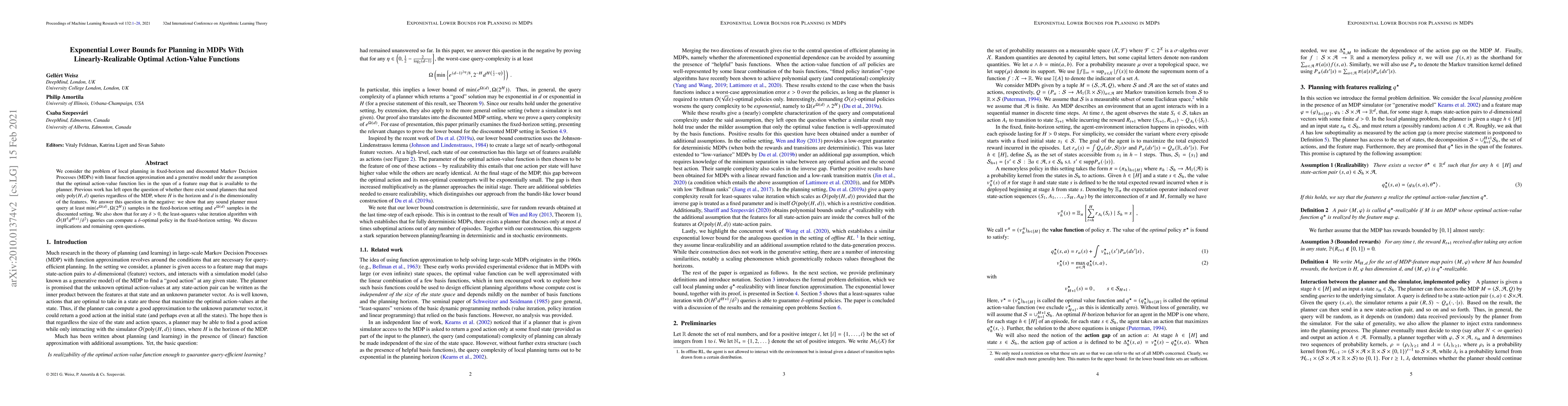 This paper establishes exponential lower bounds on the number of queries required for sound planning in MDPs with linear optimal action-value functions, showing that no poly(H,d) query planner exists. It also presents a least-squares value iteration algorithm that can compute a δ-optimal policy with a specific polynomial number of queries.