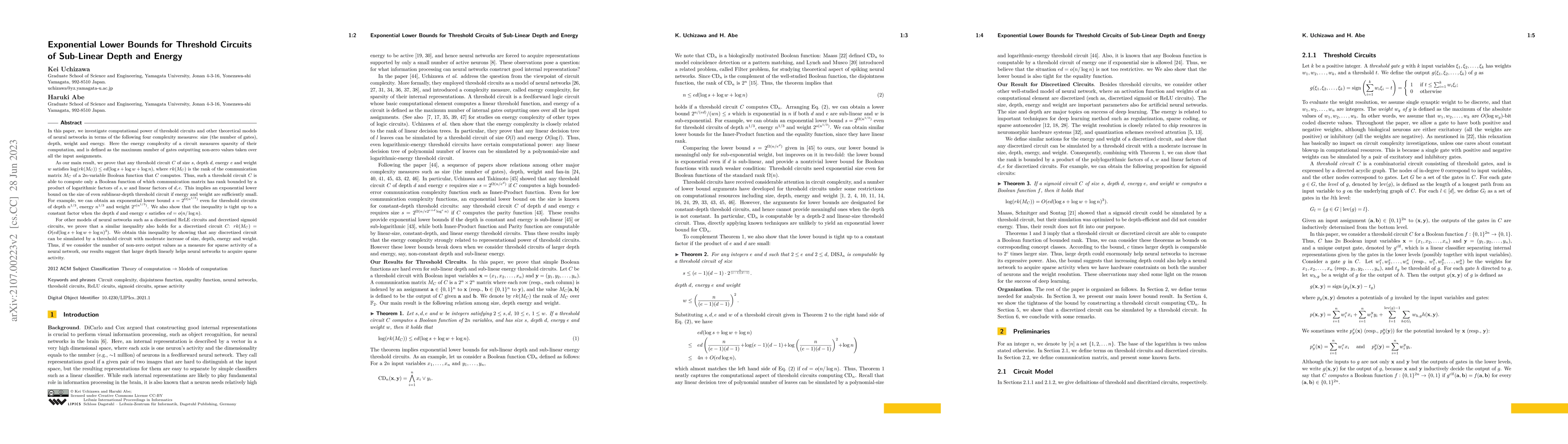 This paper establishes exponential lower bounds for threshold circuits with sub-linear depth and energy, showing they can compute only Boolean functions with a communication matrix rank bounded by logarithmic factors of size and weight and linear factors of depth and energy. This implies significant limitations on the computational power of such circuits.