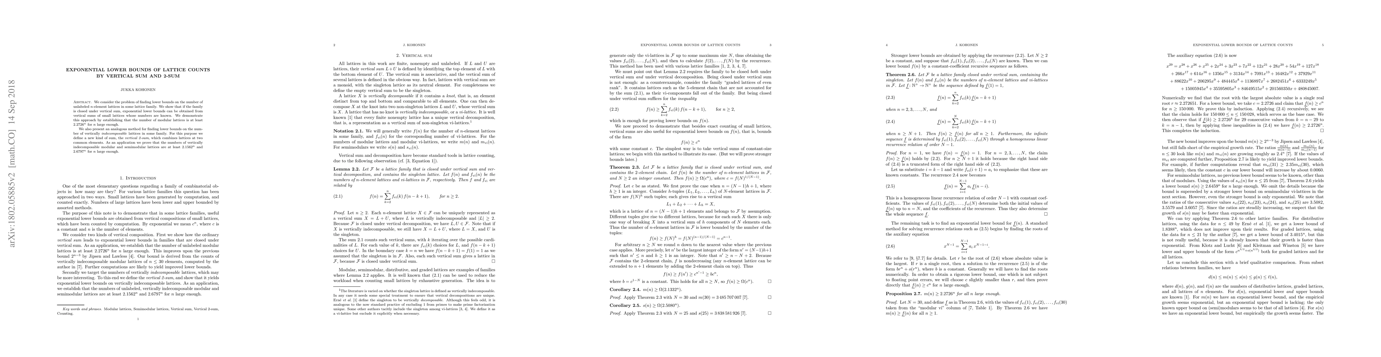 We consider the problem of finding lower bounds on the number of unlabeled $n$-element lattices in some lattice family. We show that if the family is closed under vertical sum, exponential lower bounds can be obtained from vertical sums of small lattices whose numbers are known. We demonstrate this approach by establishing that the number of modular lattices is at least $2.2726^n$ for $n$ large enough. We also present an analogous method for finding lower bounds on the number of vertically indecomposable lattices in some family. For this purpose we define a new kind of sum, the vertical 2-sum, which combines lattices at two common elements. As an application we prove that the numbers of vertically indecomposable modular and semimodular lattices are at least $2.1562^n$ and $2.6797^n$ for $n$ large enough.