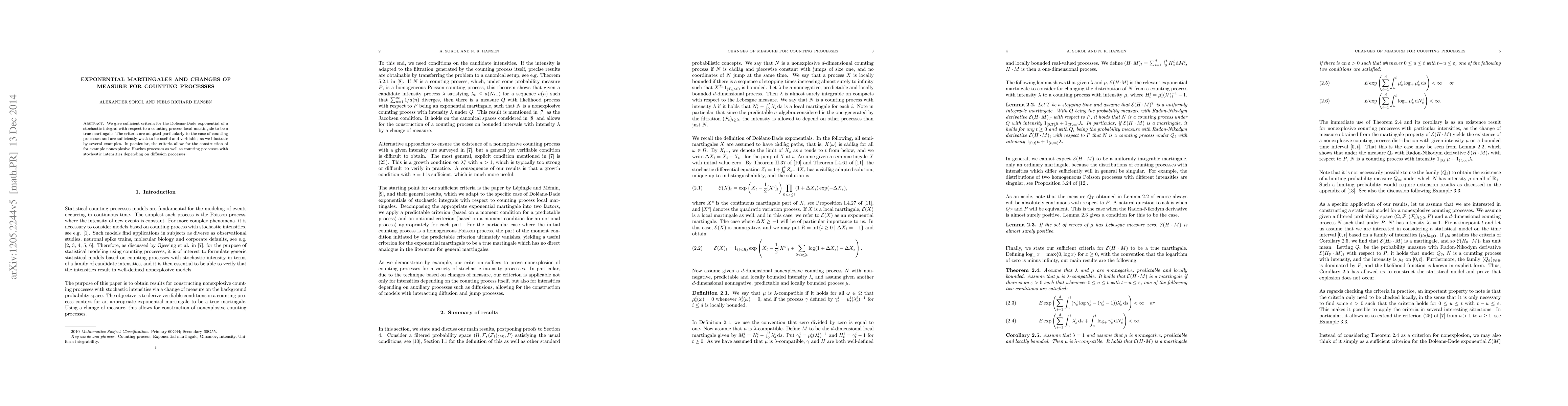 This paper presents criteria for the Doléans-Dade exponential of a stochastic integral with respect to a counting process local martingale to be a true martingale. These criteria are tailored for counting processes and are practical enough to be verified, facilitating the construction of nonexplosive Hawkes processes and counting processes with stochastic intensities dependent on diffusion processes.