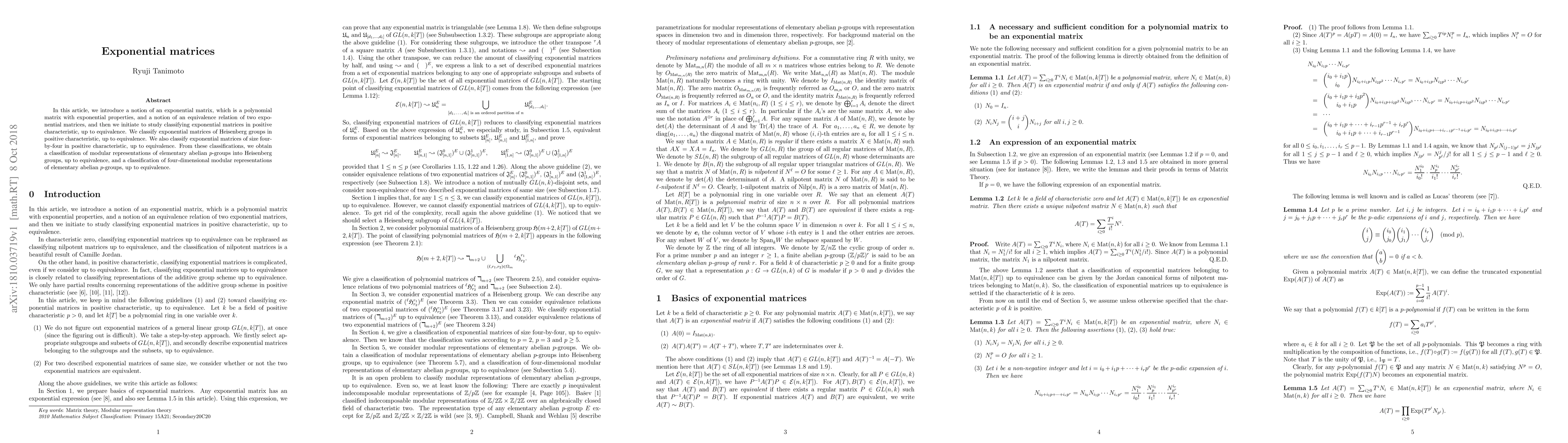 This paper introduces exponential matrices, polynomial matrices with exponential properties, and establishes an equivalence relation among them. It classifies exponential matrices of Heisenberg groups and four-by-four matrices in positive characteristic, up to equivalence. This leads to a classification of modular representations of elementary abelian p-groups into Heisenberg groups and four-dimensional modular representations of elementary abelian p-groups, also up to equivalence.