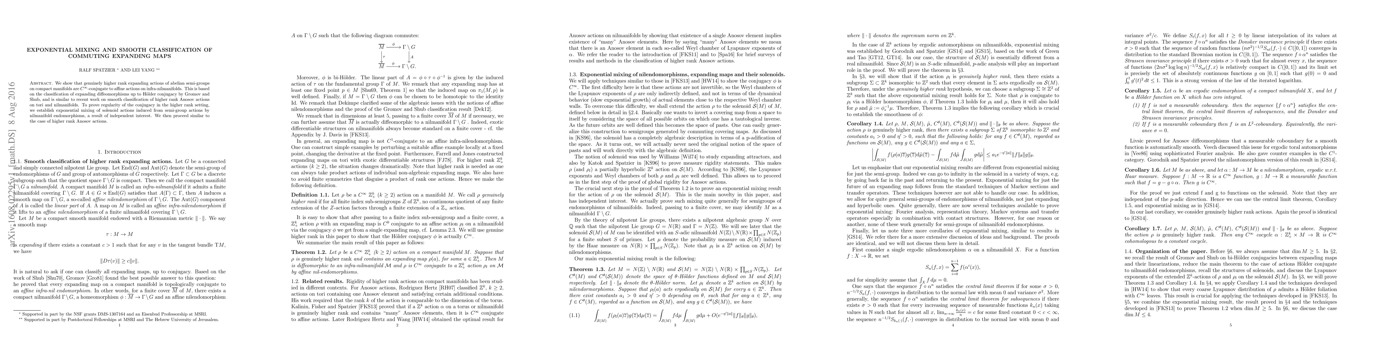 This paper demonstrates that higher rank expanding actions of abelian semi-groups on compact manifolds are $C^{\infty}$-conjugate to affine actions on infra-nilmanifolds, leveraging Gromov and Shub's classification of expanding diffeomorphisms. It also establishes exponential mixing for solenoid actions, which aids in proving the regularity of the conjugacy in the higher rank setting.