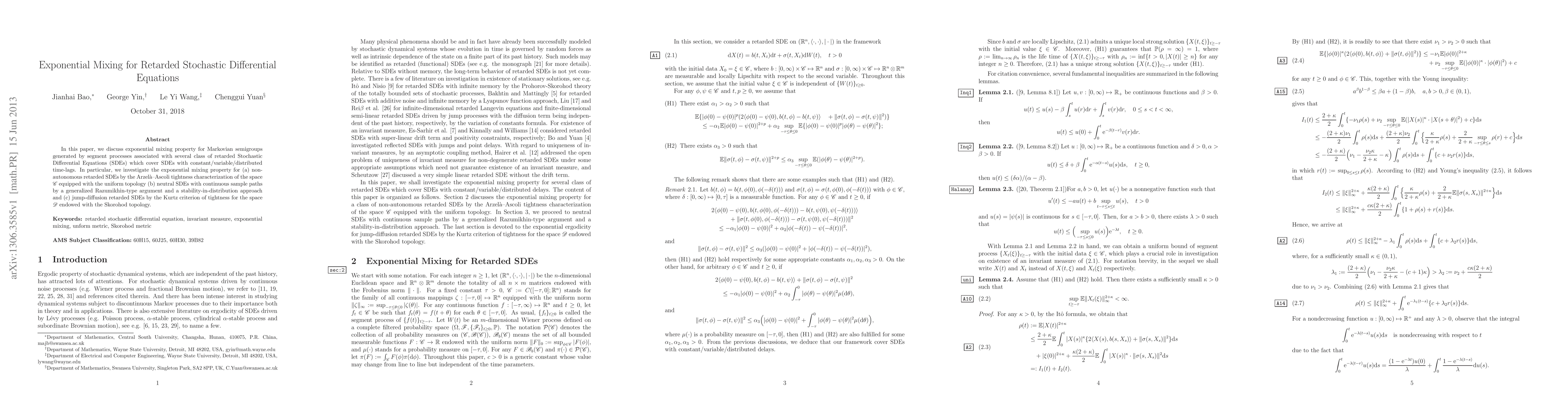 In this paper, we discuss exponential mixing property for Markovian semigroups generated by segment processes associated with several class of retarded Stochastic Differential Equations (SDEs) which cover SDEs with constant/variable/distributed time-lags. In particular, we investigate the exponential mixing property for (a) non-autonomous retarded SDEs by the Arzel\`{a}--Ascoli tightness characterization of the space $\C$ equipped with the uniform topology (b) neutral SDEs with continuous sample paths by a generalized Razumikhin-type argument and a stability-in-distribution approach and (c) jump-diffusion retarded SDEs by the Kurtz criterion of tightness for the space $\D$ endowed with the Skorohod topology.