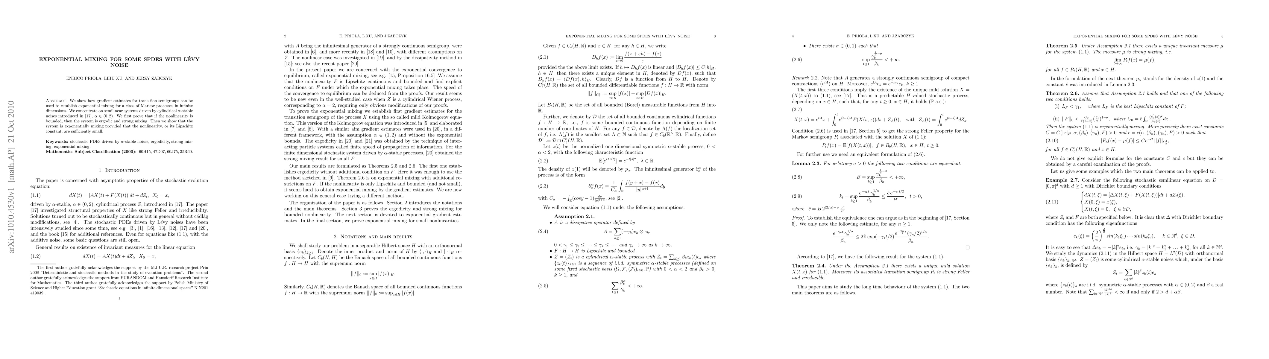 We show how gradient estimates for transition semigroups can be used to establish exponential mixing for a class of Markov processes in infinite dimensions. We concentrate on semilinear systems driven by cylindrical $\alpha$-stable noises, $\alpha \in (0,2)$, introduced in Priola-Zabczyk "Structural properties of semilinear SPDEs driven by cylindrical stable processes" (PTRF to appear). We first prove that if the nonlinearity is bounded, then the system is ergodic and strong mixing. Then we show that the system is exponentially mixing provided that the nonlinearity, or its Lipschitz constant, are sufficiently small.