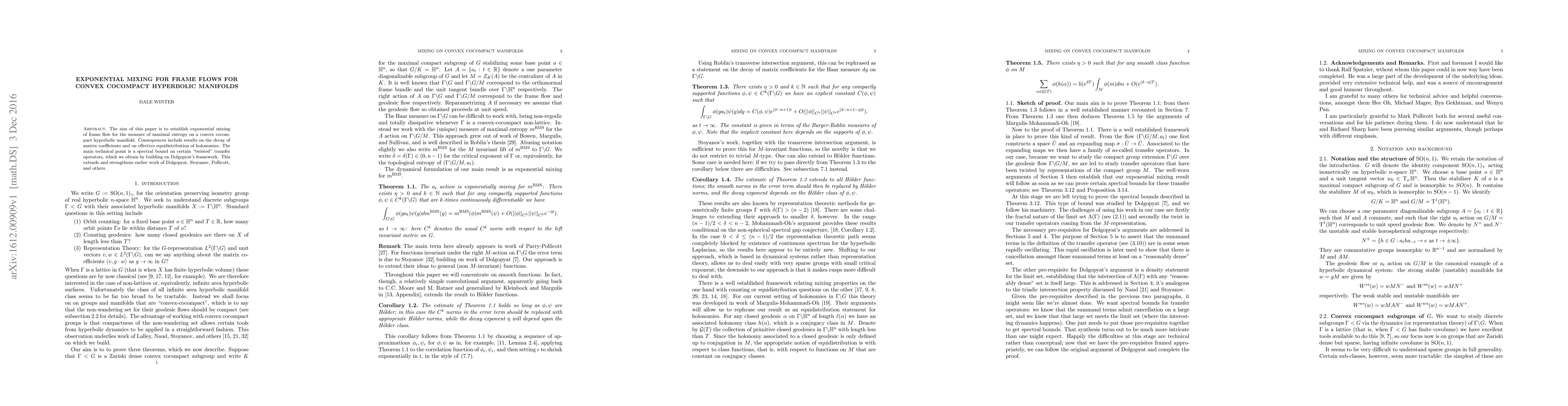 This paper establishes exponential mixing of frame flow for the maximal entropy measure on convex cocompact hyperbolic manifolds, extending prior work and utilizing a spectral bound on twisted transfer operators. It also provides implications for the decay of matrix coefficients and effective equidistribution of holonomies.