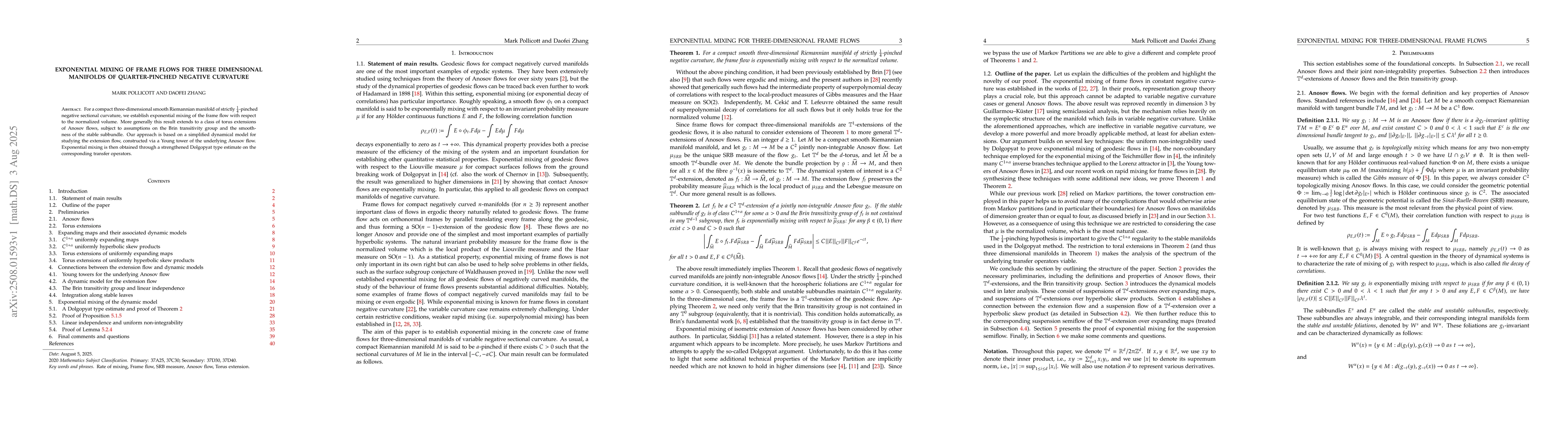 For a compact three-dimensional smooth Riemannian manifold of strictly 1/4-pinched negative sectional curvature, we establish exponential mixing of the frame flow with respect to the normalized volume. More generally this result extends to a class of torus extensions of Anosov flows, subject to assumptions on the Brin transitivity group and the smoothness of the stable subbundle. Our approach is based on a simplified dynamical model for studying the extension flow, constructed via a Young tower of the underlying Anosov flow. Exponential mixing is then obtained through a strengthened Dolgopyat type estimate on the corresponding transfer operators.