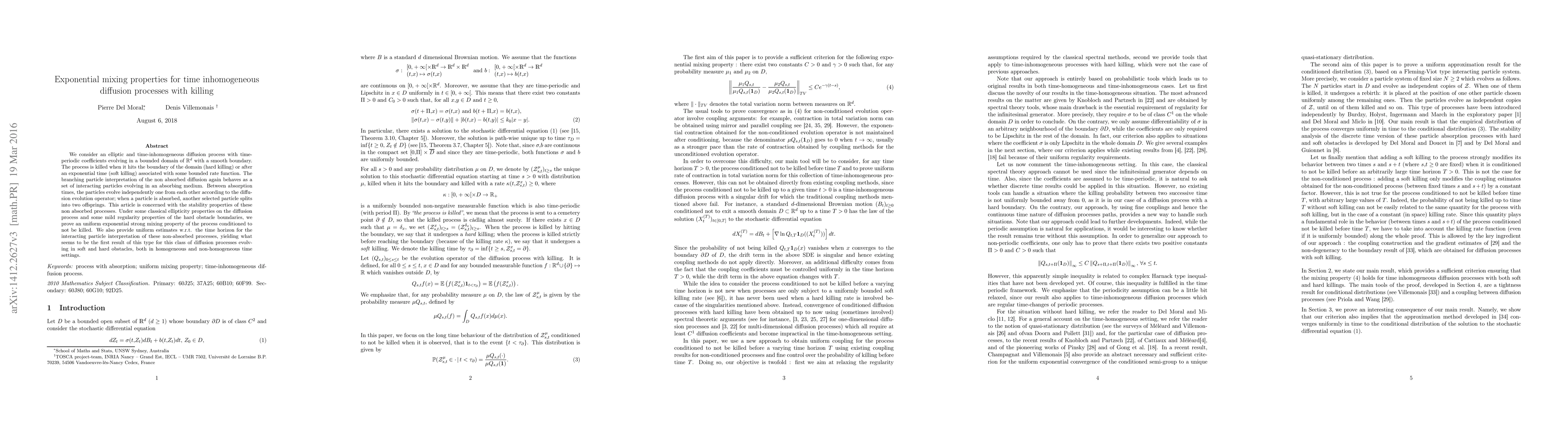 This paper investigates the exponential mixing properties of time-inhomogeneous diffusion processes with killing in bounded domains, proving uniform exponential strong mixing under certain ellipticity and regularity conditions. It also provides uniform estimates for the interacting particle interpretation of these processes, offering novel results for both soft and hard killing scenarios.