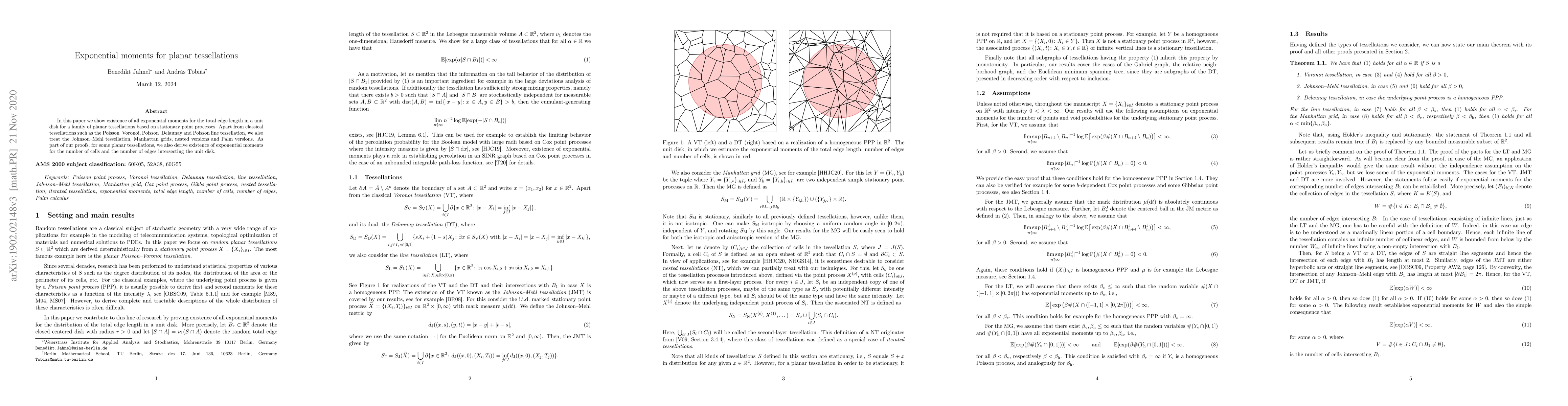 This paper demonstrates the existence of exponential moments for the total edge length in a unit disk for various planar tessellations derived from stationary point processes, including classical examples and more complex forms like Johnson-Mehl tessellations and Manhattan grids. Additionally, it proves the existence of exponential moments for the number of cells and edges intersecting the unit disk for some tessellations.