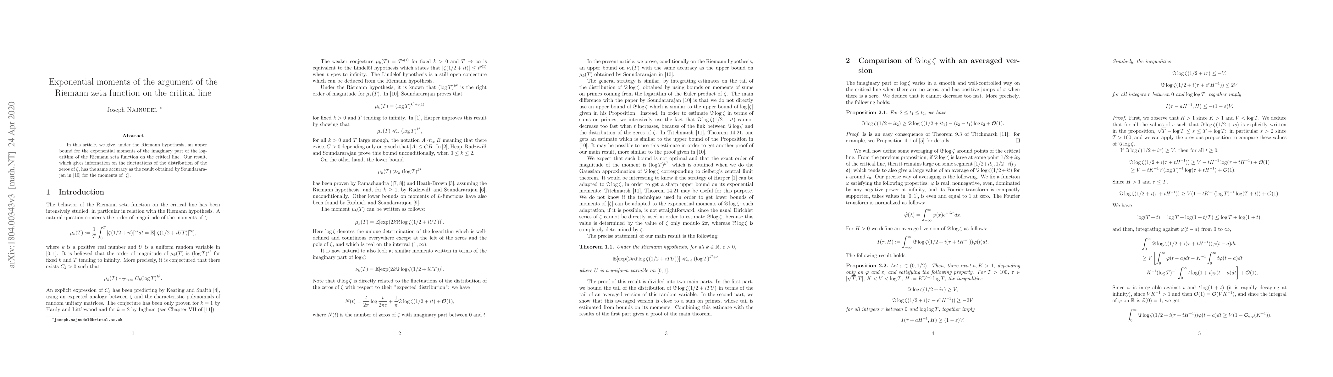 Summary: This paper provides an upper bound for the exponential moments of the imaginary part of the logarithm of the Riemann zeta function on the critical line under the Riemann hypothesis, offering insights into the distribution fluctuations of the zeta function's zeros with accuracy comparable to Soundararajan's prior work.