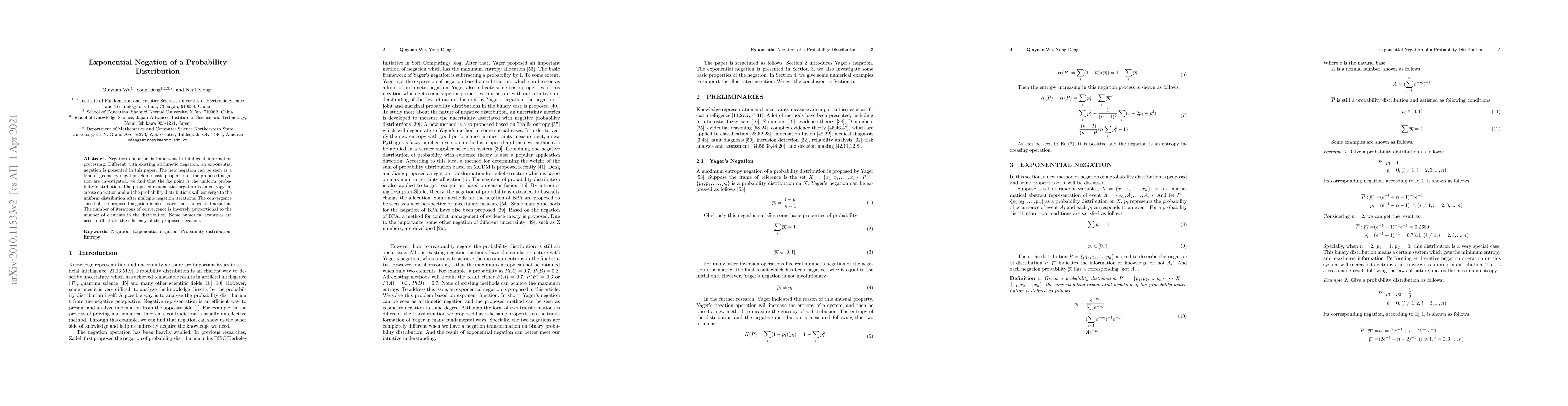 Negation operation is important in intelligent information processing. Different with existing arithmetic negation, an exponential negation is presented in this paper. The new negation can be seen as a kind of geometry negation. Some basic properties of the proposed negation is investigated, we find that the fix point is the uniform probability distribution. The negation is an entropy increase operation and all the probability distributions will converge to the uniform distribution after multiple negation iterations. The number of iterations of convergence is inversely proportional to the number of elements in the distribution. Some numerical examples are used to illustrate the efficiency of the proposed negation.