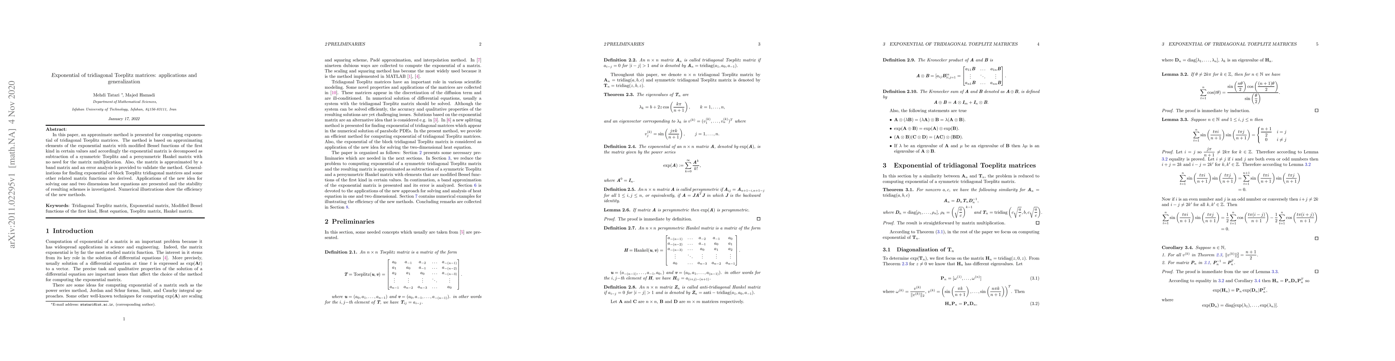 In this paper, an approximate method is presented for computing exponential of tridiagonal Toeplitz matrices. The method is based on approximating elements of the exponential matrix with modified Bessel functions of the first kind in certain values and accordingly the exponential matrix is decomposed as subtraction of a symmetric Toeplitz and a persymmetric Hankel matrix with no need for the matrix multiplication. Also, the matrix is approximated by a band matrix and an error analysis is provided to validate the method. Generalizations for finding exponential of block Toeplitz tridiagonal matrices and some other related matrix functions are derived. Applications of the new idea for solving one and two dimensions heat equations are presented and the stability of resulting schemes is investigated. Numerical illustrations show the efficiency of the new methods.
