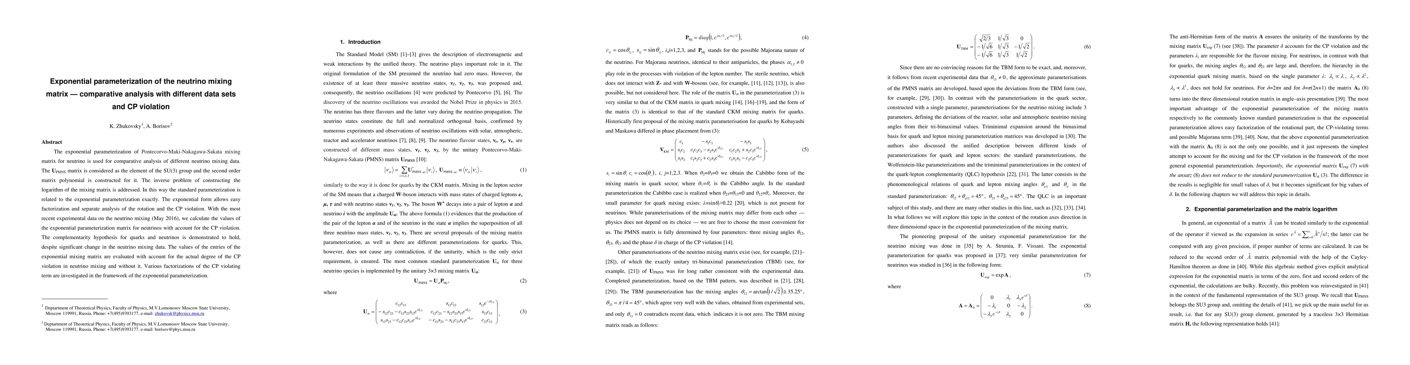 This paper explores the exponential parameterization of the neutrino mixing matrix, comparing it with standard parameterizations and analyzing CP violation using recent data. It demonstrates the complementarity hypothesis for neutrinos and quarks, and evaluates the matrix's entries with and without CP violation.