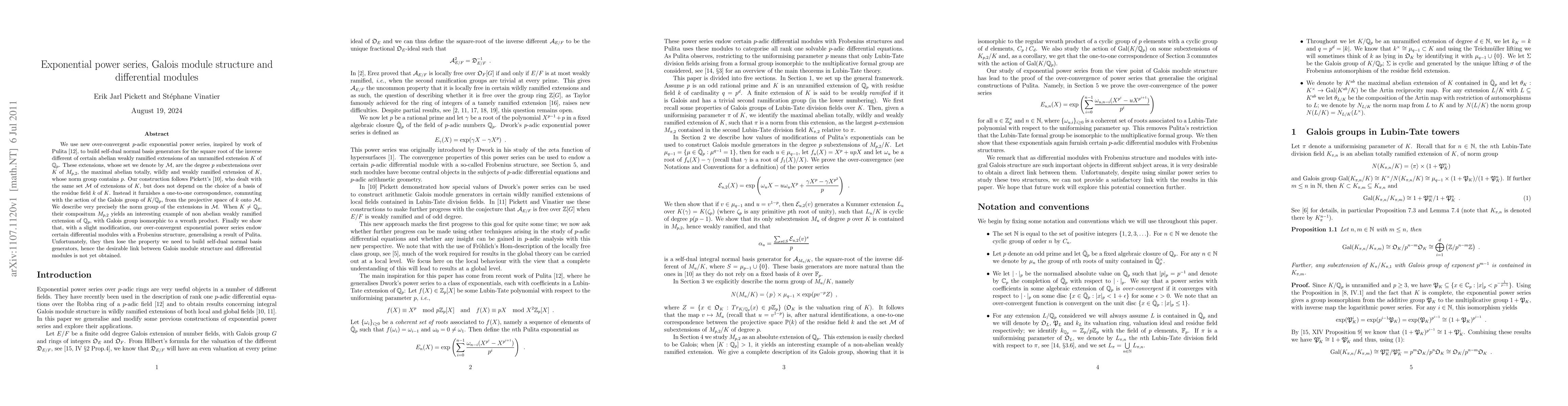 We use new over-convergent p-adic exponential power series, inspired by work of Pulita, to build self-dual normal basis generators for the square root of the inverse different of certain abelian weakly ramified extensions of an unramified extension K of Qp. These extensions, whose set we denote by M, are the degree p subextensions over K of Mp,2, the maximal abelian totally, wildly and weakly ramified extension of K, whose norm group contains p. Our construction follows Pickett's, who dealt with the same set M of extensions of K, but does not depend on the choice of a basis of the residue field k of K. Instead it furnishes a one-to-one correspondence, commuting with the action of the Galois group of K/Qp, from the projective space of k onto M. We describe very precisely the norm group of the extensions in M. When K is not equal to Qp, their compositum Mp,2 yields an interesting example of non abelian weakly ramified extension of Qp, with Galois group isomorphic to a wreath product. Finally we show that, with a slight modification, our over-convergent exponential power series endow certain differential modules with a Frobenius structure, generalising a result of Pulita. Unfortunately, they then lose the property we need to build self-dual normal basis generators, hence the desirable link between Galois module structure and differential modules is not yet obtained.