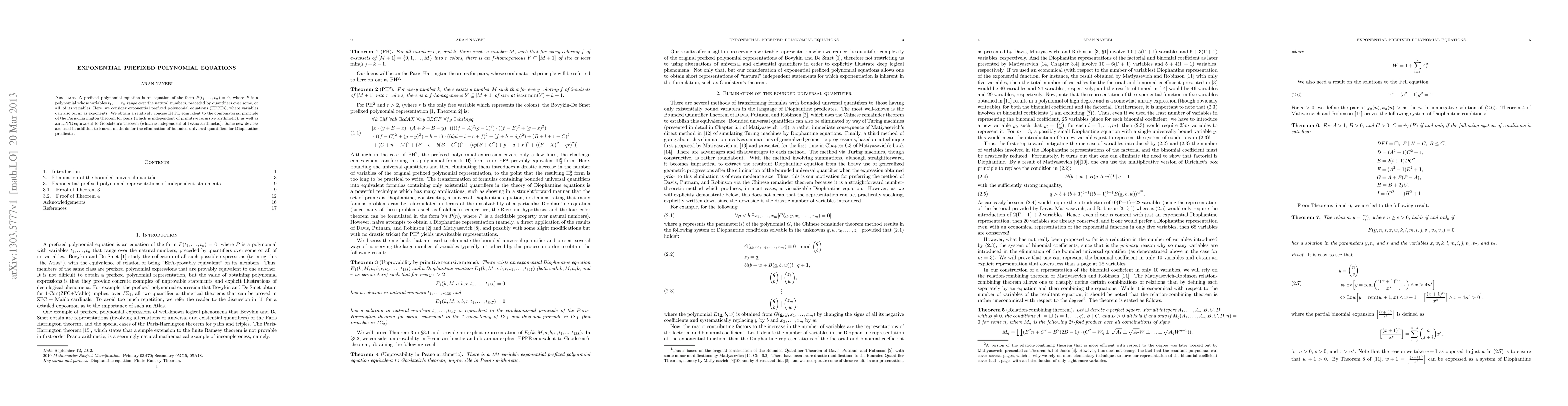 A prefixed polynomial equation is an equation of the form $P(t_1,\ldots,t_n) = 0$, where $P$ is a polynomial whose variables $t_1,\ldots,t_n$ range over the natural numbers, preceded by quantifiers over some, or all, of its variables. Here, we consider exponential prefixed polynomial equations (EPPEs), where variables can also occur as exponents. We obtain a relatively concise EPPE equivalent to the combinatorial principle of the Paris-Harrington theorem for pairs (which is independent of primitive recursive arithmetic), as well as an EPPE equivalent to Goodstein's theorem (which is independent of Peano arithmetic). Some new devices are used in addition to known methods for the elimination of bounded universal quantifiers for Diophantine predicates.