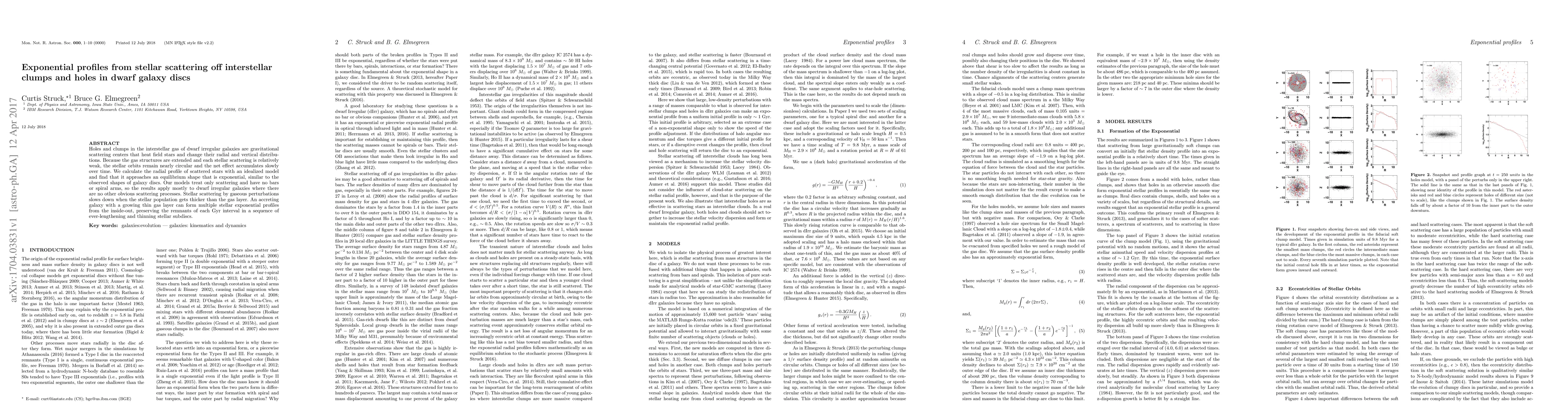 This paper investigates how interstellar gas clumps and holes in dwarf galaxies scatter stars, leading to an exponential radial profile over time. The study finds that without bars or spiral arms, the scattered stars form an equilibrium shape similar to observed galaxy discs, particularly in dwarf irregular galaxies.