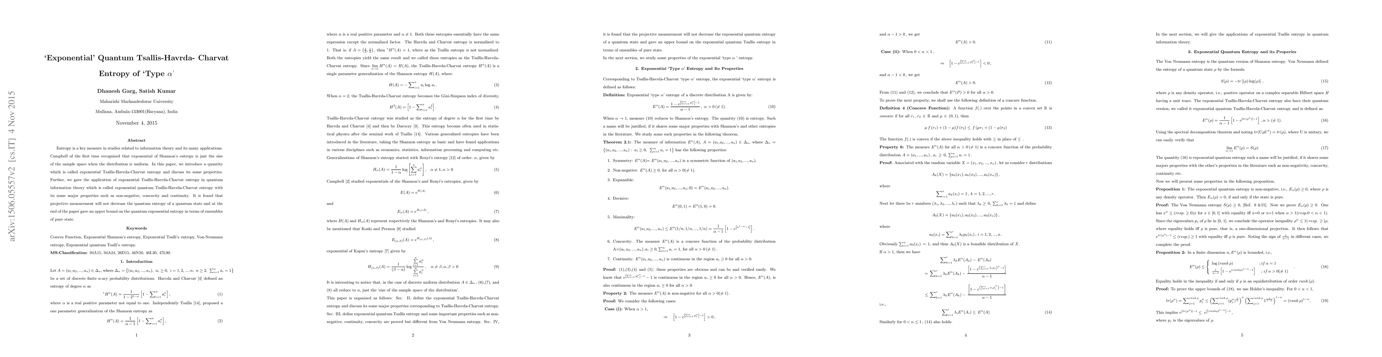 This paper introduces the concept of exponential Tsallis Havrda Charvat entropy and explores its properties, applying it to quantum information theory as exponential quantum Tsallis Havrda Charvat entropy. The study finds that projective measurements do not decrease quantum entropy, and provides an upper bound for this quantum entropy in terms of pure state ensembles.