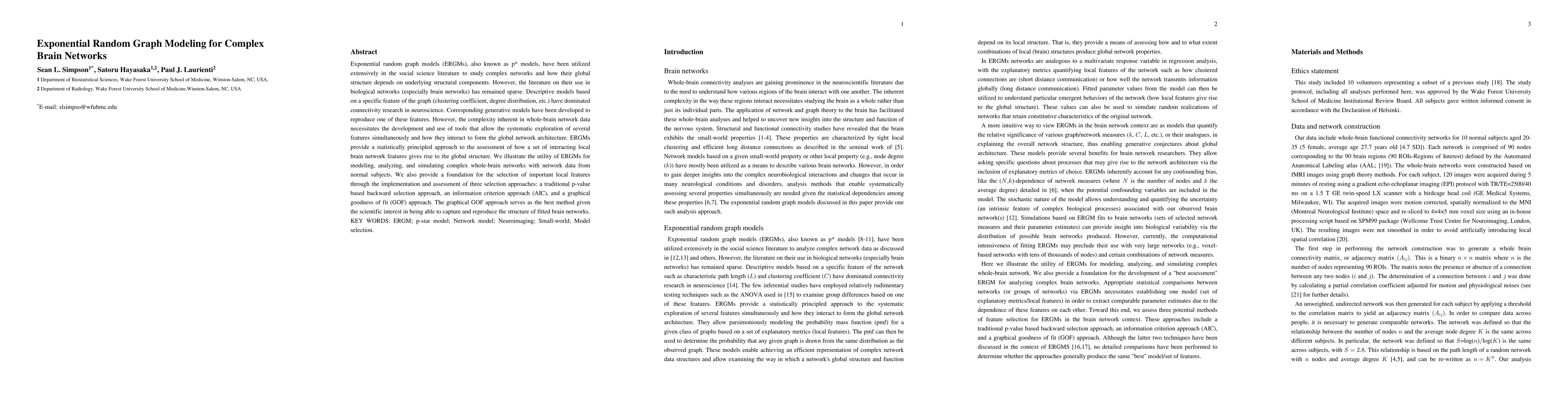 This study introduces Exponential Random Graph Modeling (ERGMs) for analyzing complex brain networks, allowing for the exploration of multiple features and their interactions to understand global network architecture.