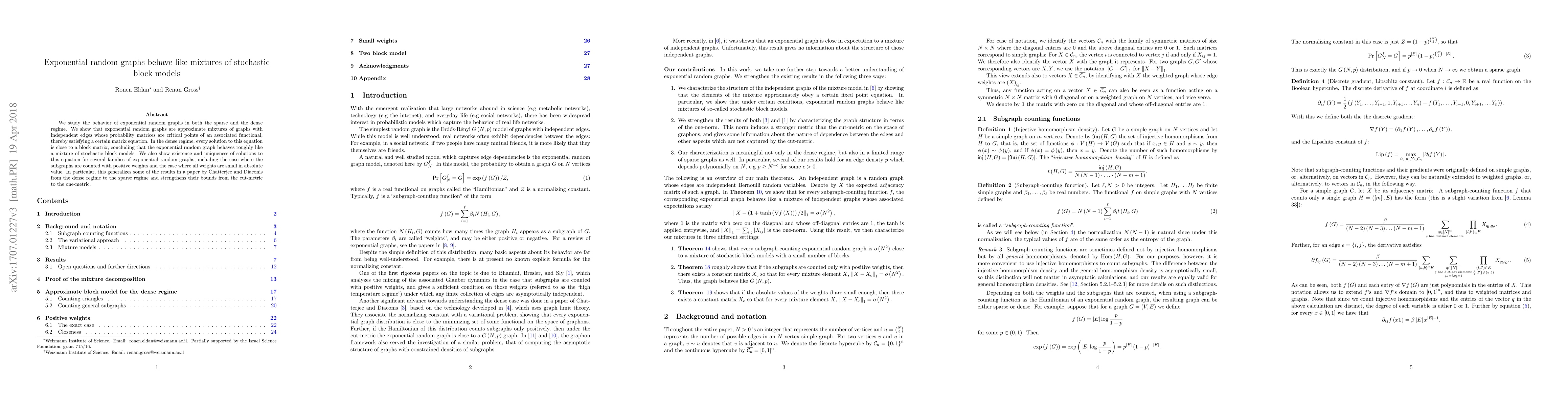 This paper demonstrates that exponential random graphs exhibit behavior akin to mixtures of stochastic block models, showing that they approximate graphs with independent edges whose probability matrices solve a specific matrix equation. The study extends results from the dense regime to the sparse regime, proving existence and uniqueness of solutions for various exponential random graph families.