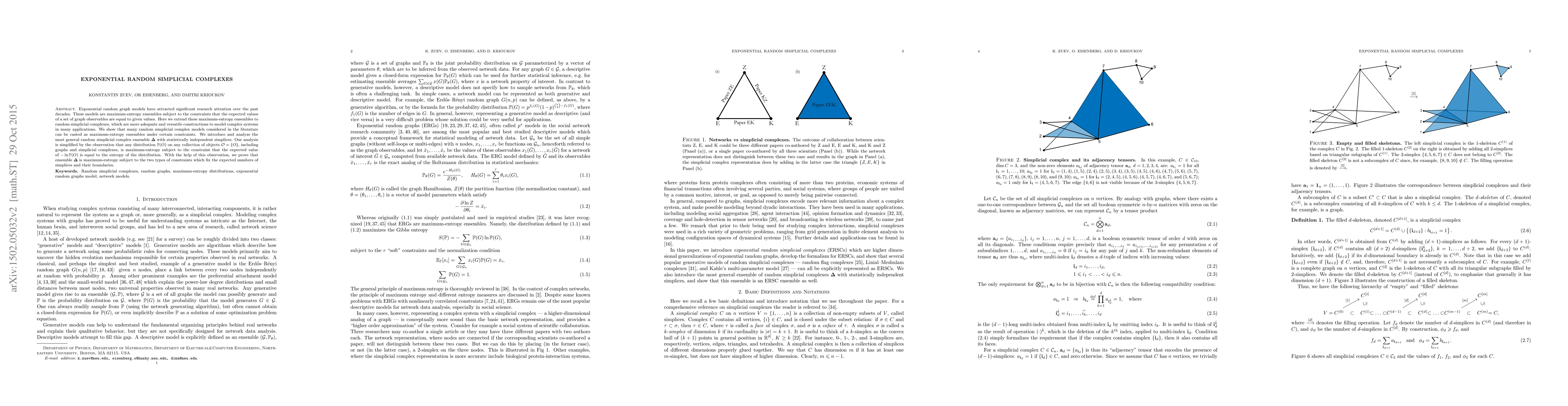 This paper extends exponential random graph models to random simplicial complexes, introducing a general maximum-entropy ensemble $\mathbf{\Delta}$ for these structures under constraints on expected simplices and their boundaries. The analysis leverages the insight that any distribution is maximum-entropy when constrained by its entropy.