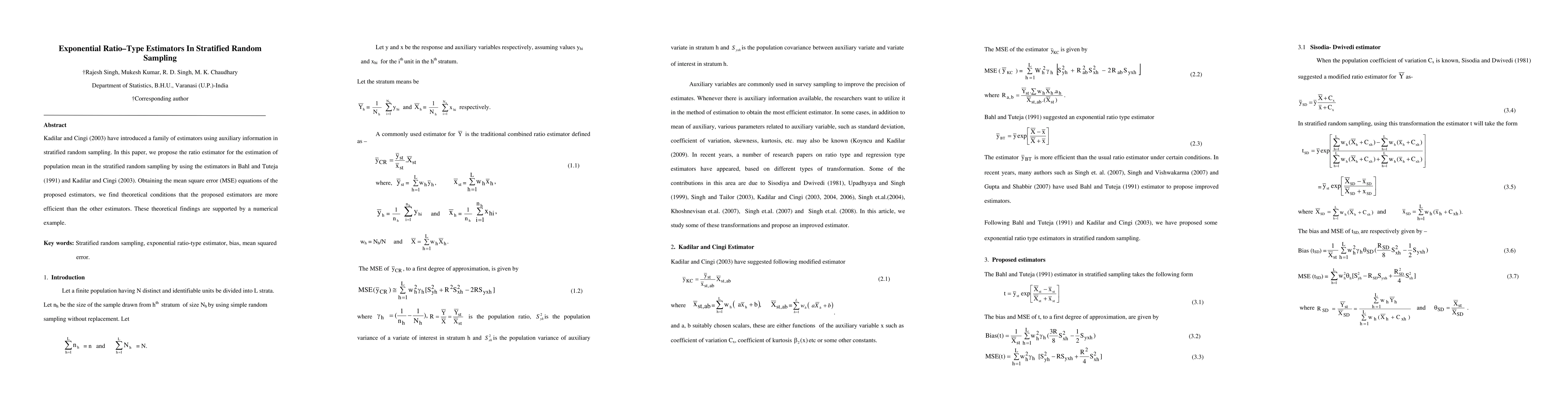 This paper proposes a new ratio estimator for estimating the population mean in stratified random sampling, utilizing auxiliary information from Bahl and Tuteja (1991) and Kadilar and Cingi (2003). Theoretical analysis shows that the proposed estimators outperform existing ones under certain conditions, which is validated through a numerical example.