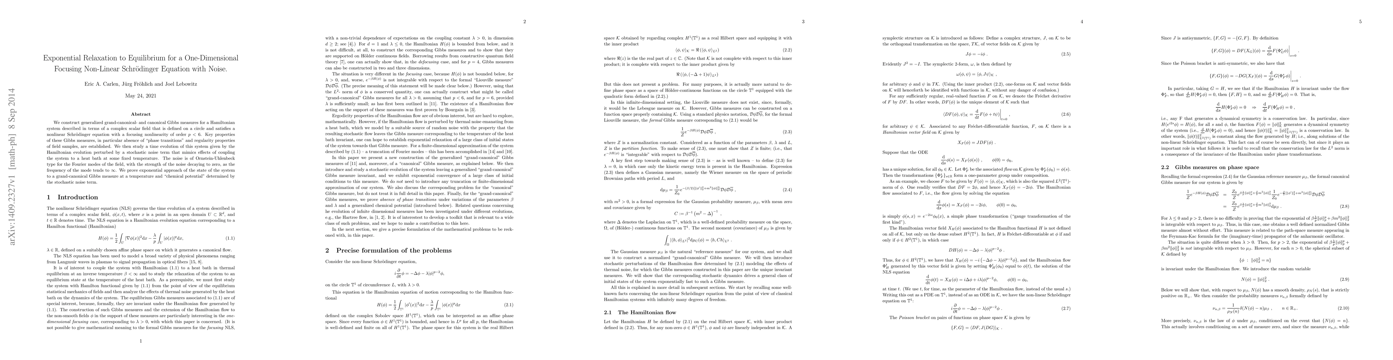 We construct generalized grand-canonical- and canonical Gibbs measures for a Hamiltonian system described in terms of a complex scalar field that is defined on a circle and satisfies a nonlinear Schr\"odinger equation with a focusing nonlinearity of order $p<6$. Key properties of these Gibbs measures, in particular absence of "phase transitions" and regularity properties of field samples, are established. We then study a time evolution of this system given by the Hamiltonian evolution perturbed by a stochastic noise term that mimics effects of coupling the system to a heat bath at some fixed temperature. The noise is of Ornstein-Uhlenbeck type for the Fourier modes of the field, with the strength of the noise decaying to zero, as the frequency of the mode tends to $\infty$. We prove exponential approach of the state of the system to a grand-canonical Gibbs measure at a temperature and "chemical potential" determined by the stochastic noise term.