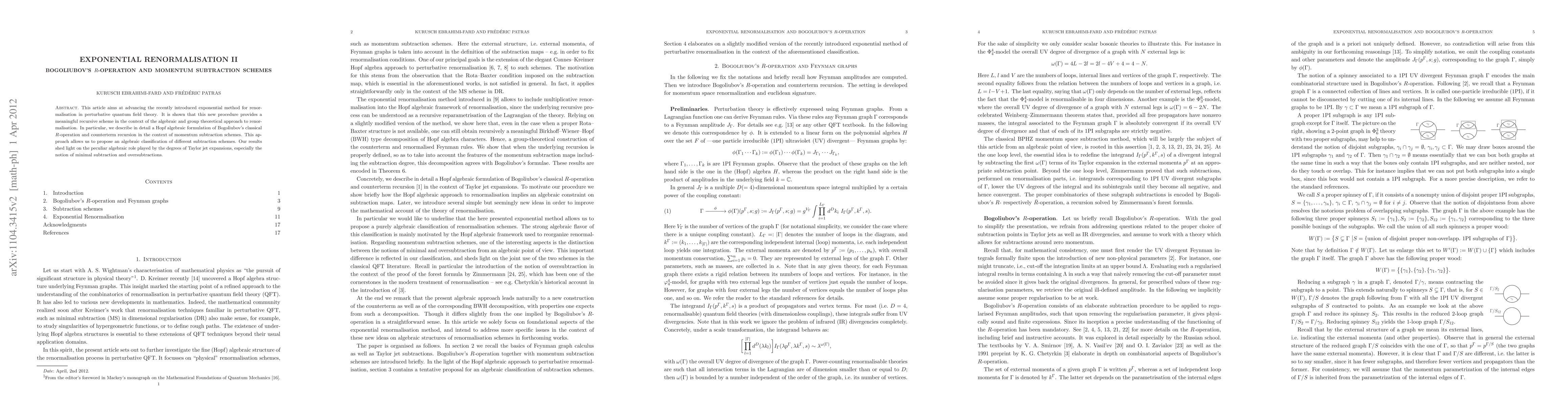 This article aims at advancing the recently introduced exponential method for renormalisation in perturbative quantum field theory. It is shown that this new procedure provides a meaningful recursive scheme in the context of the algebraic and group theoretical approach to renormalisation. In particular, we describe in detail a Hopf algebraic formulation of Bogoliubov's classical R-operation and counterterm recursion in the context of momentum subtraction schemes. This approach allows us to propose an algebraic classification of different subtraction schemes. Our results shed light on the peculiar algebraic role played by the degrees of Taylor jet expansions, especially the notion of minimal subtraction and oversubtractions.