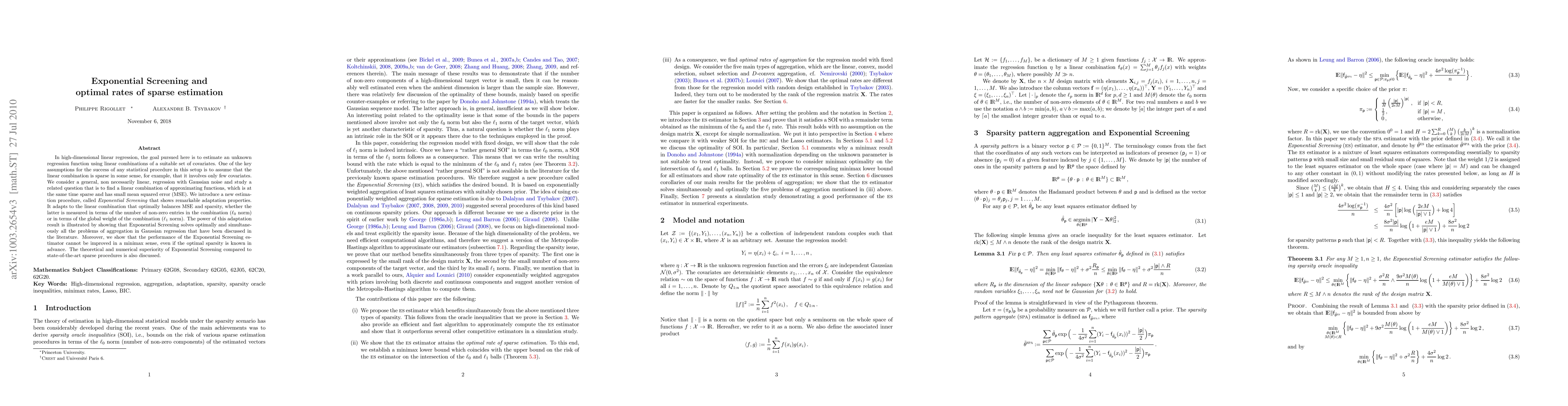 This paper introduces Exponential Screening, a novel estimation procedure for high-dimensional linear regression that optimally balances mean squared error and sparsity. It demonstrates the procedure's theoretical and numerical superiority over existing sparse methods, proving its minimax optimality even when the optimal sparsity is known.