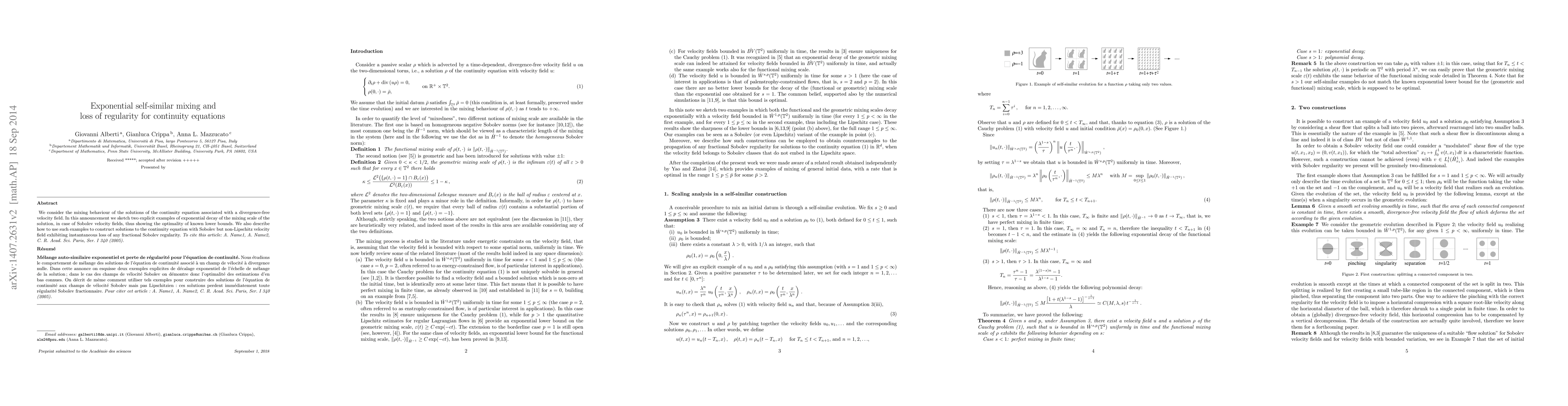We consider the mixing behaviour of the solutions of the continuity equation associated with a divergence-free velocity field. In this announcement we sketch two explicit examples of exponential decay of the mixing scale of the solution, in case of Sobolev velocity fields, thus showing the optimality of known lower bounds. We also describe how to use such examples to construct solutions to the continuity equation with Sobolev but non-Lipschitz velocity field exhibiting instantaneous loss of any fractional Sobolev regularity.