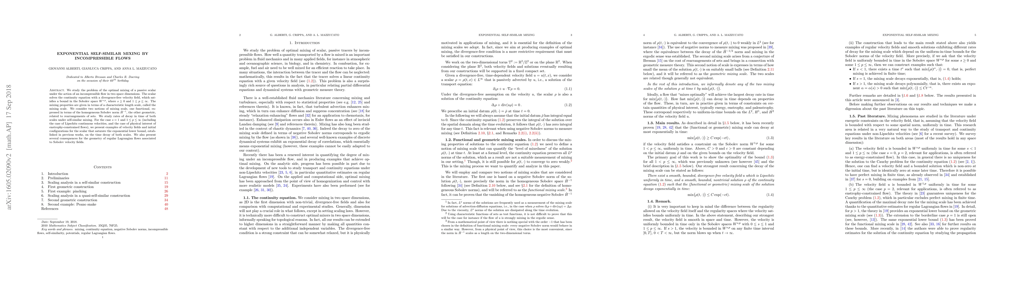 This paper investigates optimal mixing of a passive scalar under incompressible flows in two dimensions, focusing on the decay rates of two mixing scales under self-similar mixing. It presents examples of velocity fields that achieve the exponential lower bound for the decay rates of these scales, with implications for the geometry of regular Lagrangian flows.