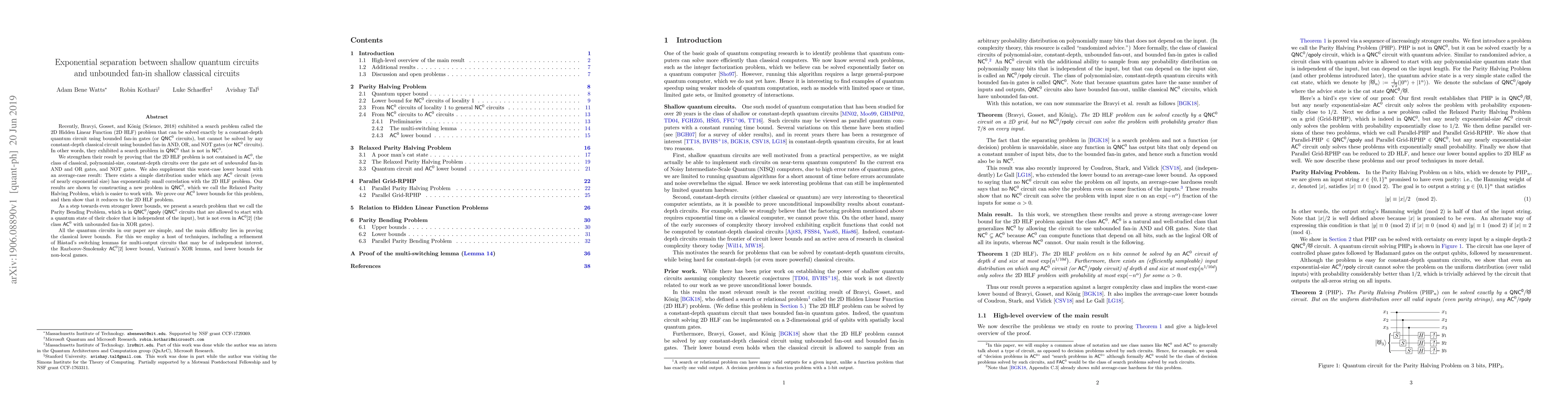 This paper demonstrates an exponential separation between shallow quantum circuits (QNC^0) and unbounded fan-in shallow classical circuits (AC^0), showing that the 2D Hidden Linear Function problem is in QNC^0 but not in AC^0. It also proves that the problem has exponentially small correlation with AC^0 circuits on average.
