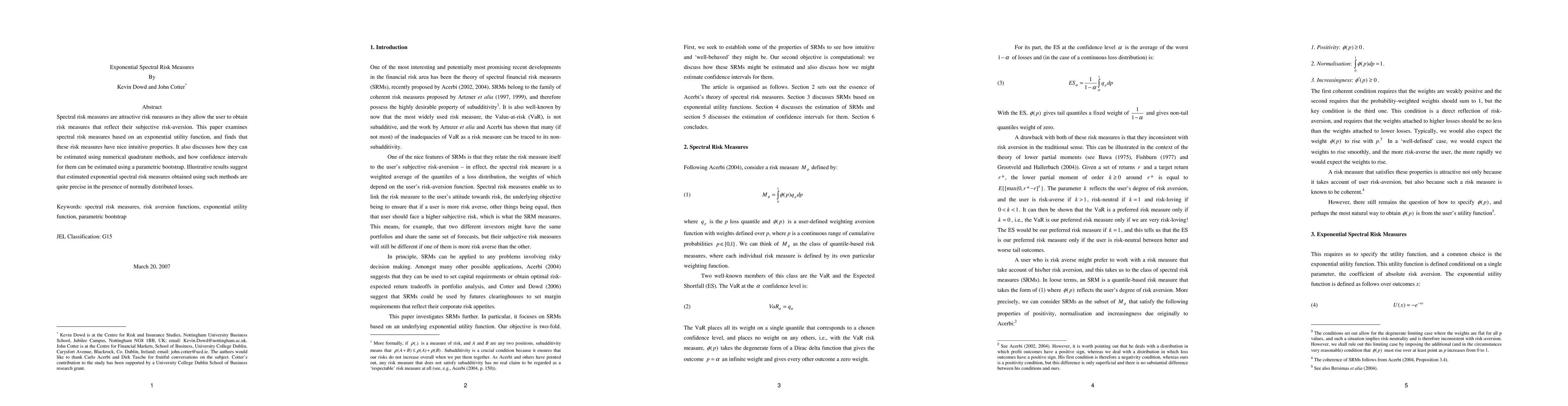 Spectral risk measures are attractive risk measures as they allow the user to obtain risk measures that reflect their subjective risk-aversion. This paper examines spectral risk measures based on an exponential utility function, and finds that these risk measures have nice intuitive properties. It also discusses how they can be estimated using numerical quadrature methods, and how confidence intervals for them can be estimated using a parametric bootstrap. Illustrative results suggest that estimated exponential spectral risk measures obtained using such methods are quite precise in the presence of normally distributed losses.