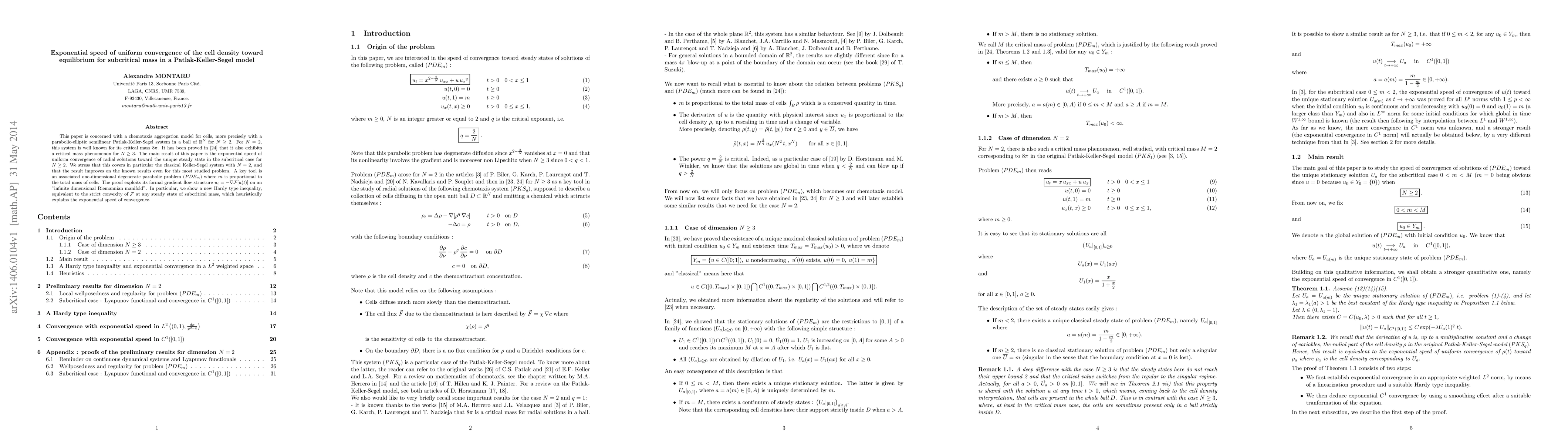 This paper is concerned with a chemotaxis aggregation model for cells, more precisely with a parabolic-elliptic semilinear Patlak-Keller-Segel system in a ball of $\mathbb{R}^N$ for $N\geq 2$. For $N=2$, this system is well known for its critical mass $8\pi$. It has been proved in \cite{Montaru2} that it also exhibits a critical mass phenomenon for $N\geq 3$. The main result of this paper is the exponential speed of uniform convergence of radial solutions toward the unique steady state in the subcritical case for $N\geq 2$. We stress that this covers in particular the classical Keller-Segel system with $N=2$, and that the result improves on the known results even for this most studied problem. A key tool is an associated one-dimensional degenerate parabolic problem $(PDE_m)$ where $m$ is proportional to the total mass of cells. The proof exploits its formal gradient flow structure $u_t=-\nabla \mathcal{F}[u(t)]$ on an "infinite dimensional Riemannian manifold". In particular, we show a new Hardy type inequality, equivalent to the strict convexity of $\mathcal{F}$ at any steady state of subcritical mass, which heuristically explains the exponential speed of convergence.