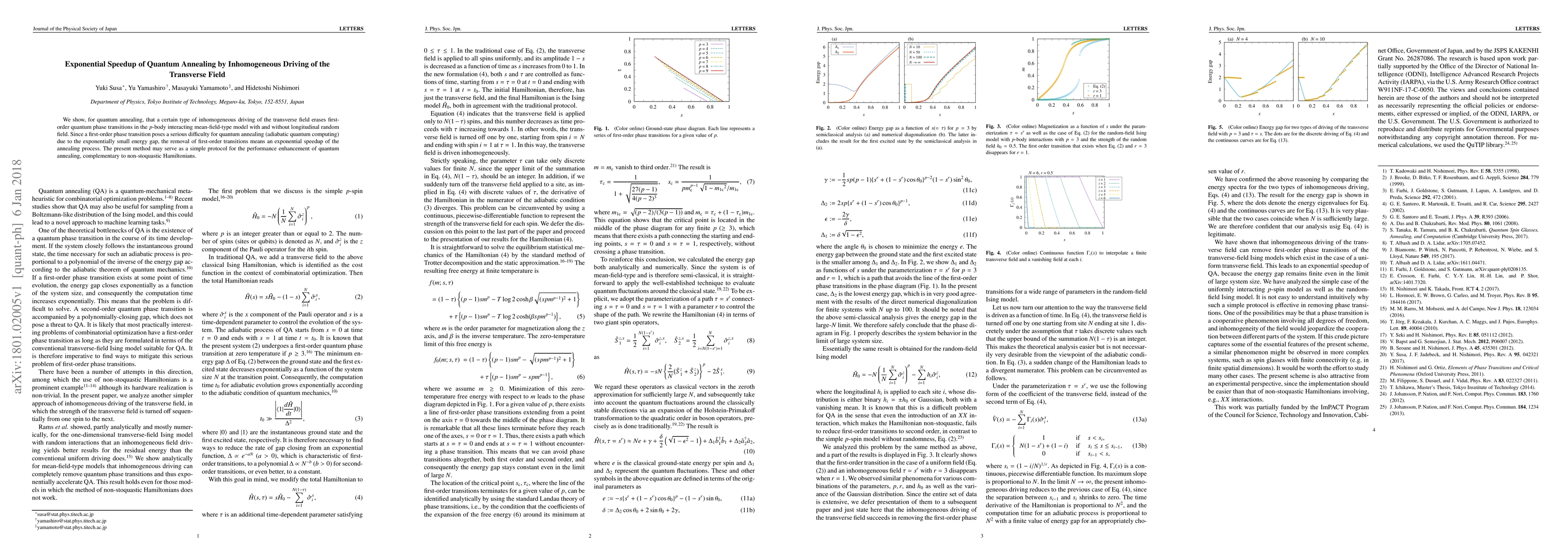 We show, for quantum annealing, that a certain type of inhomogeneous driving of the transverse field erases first-order quantum phase transitions in the p-body interacting mean-field-type model with and without longitudinal random field. Since a first-order phase transition poses a serious difficulty for quantum annealing (adiabatic quantum computing) due to the exponentially small energy gap, the removal of first-order transitions means an exponential speedup of the annealing process. The present method may serve as a simple protocol for the performance enhancement of quantum annealing, complementary to non-stoquastic Hamiltonians.