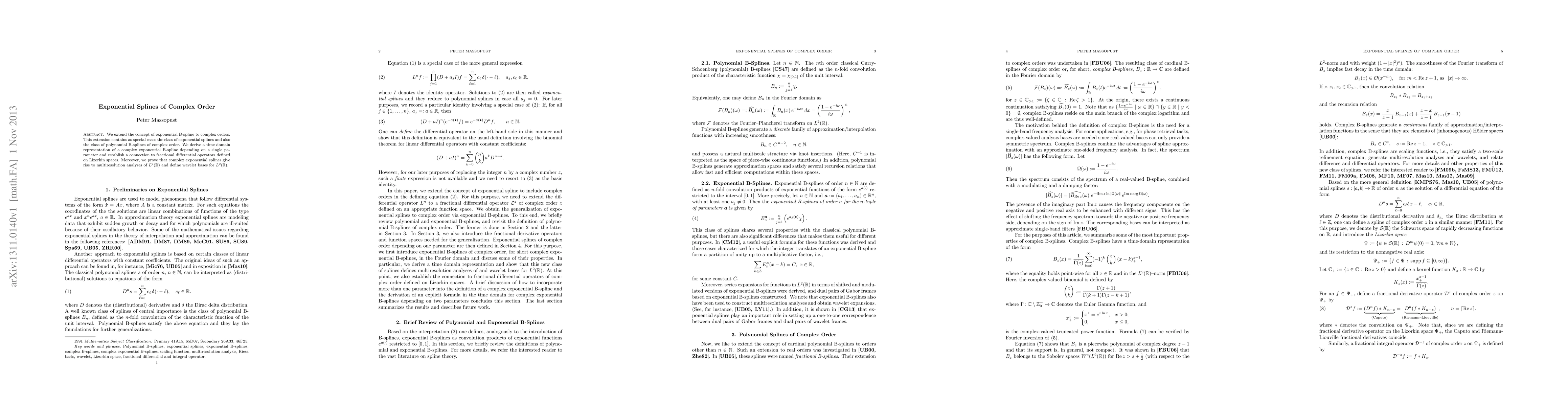 This paper extends exponential B-splines to complex orders, deriving a time-domain representation and linking them to fractional differential operators. It also establishes multiresolution analyses and defines wavelet bases for $L^2(\mathbb{R})$.
