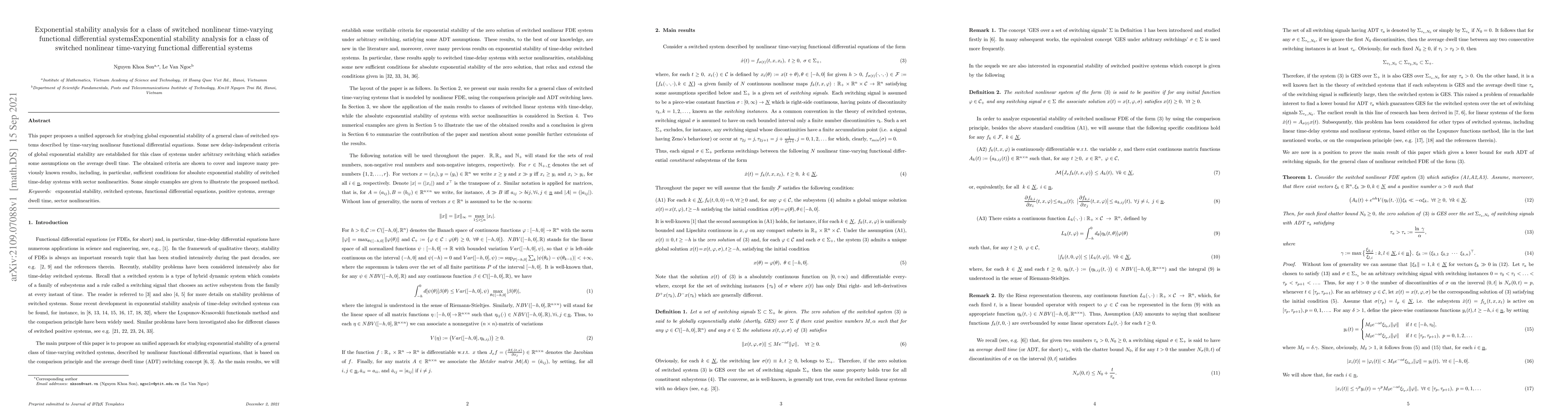 This paper proposes a unified approach for studying global exponential stability of a general class of switched systems described by time-varying nonlinear functional differential equations. Some new delay-independent criteria of global exponential stability are established for this class of systems under arbitrary switching which satisfies some assumptions on the average dwell time. The obtained criteria are shown to cover and improve many previously known results, including, in particular, sufficient conditions for absolute exponential stability of switched time-delay systems with sector nonlinearities. Some simple examples are given to illustrate the proposed method.