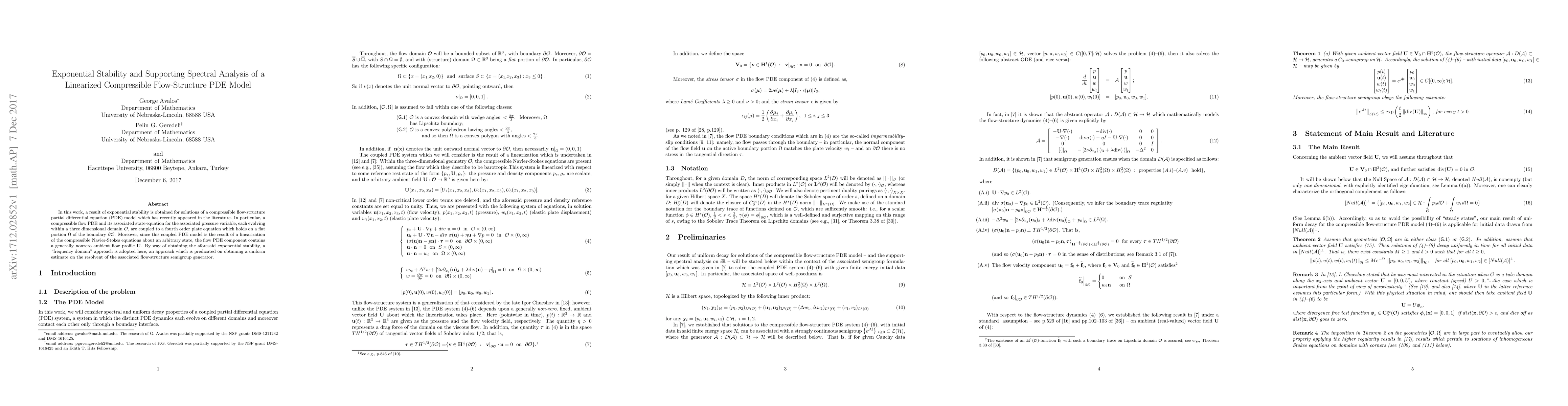 This paper establishes exponential stability for a linearized compressible flow-structure PDE model, coupling a compressible flow PDE with a plate equation on a boundary. The stability is achieved through a frequency domain analysis, providing a uniform estimate on the resolvent of the system's generator.