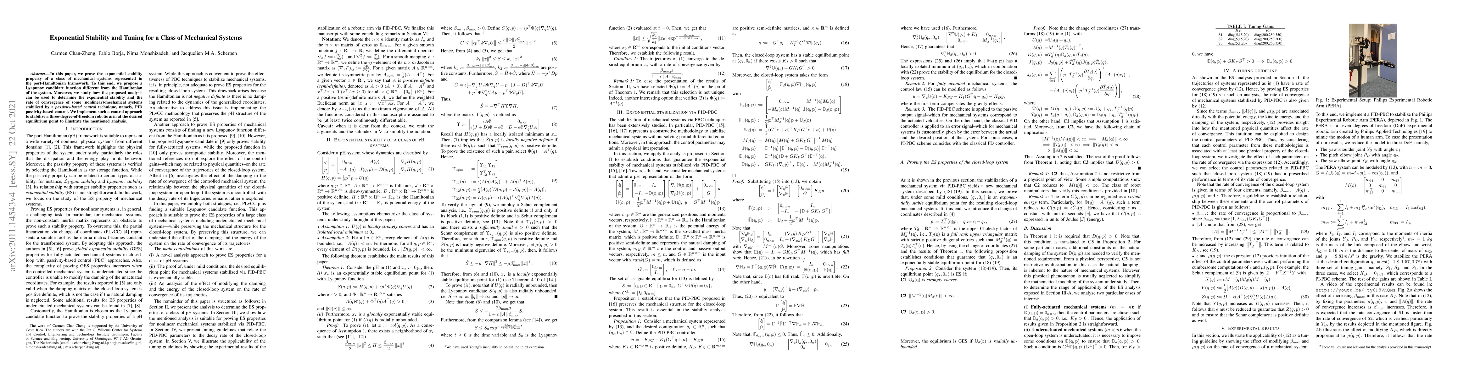 This paper proves exponential stability for a class of mechanical systems using a novel Lyapunov candidate function. It also explores the application of PID passivity-based control and interconnection and damping assignment techniques to achieve stability and determine convergence rates, demonstrating the approach with a three-degrees-of-freedom robotic arm.